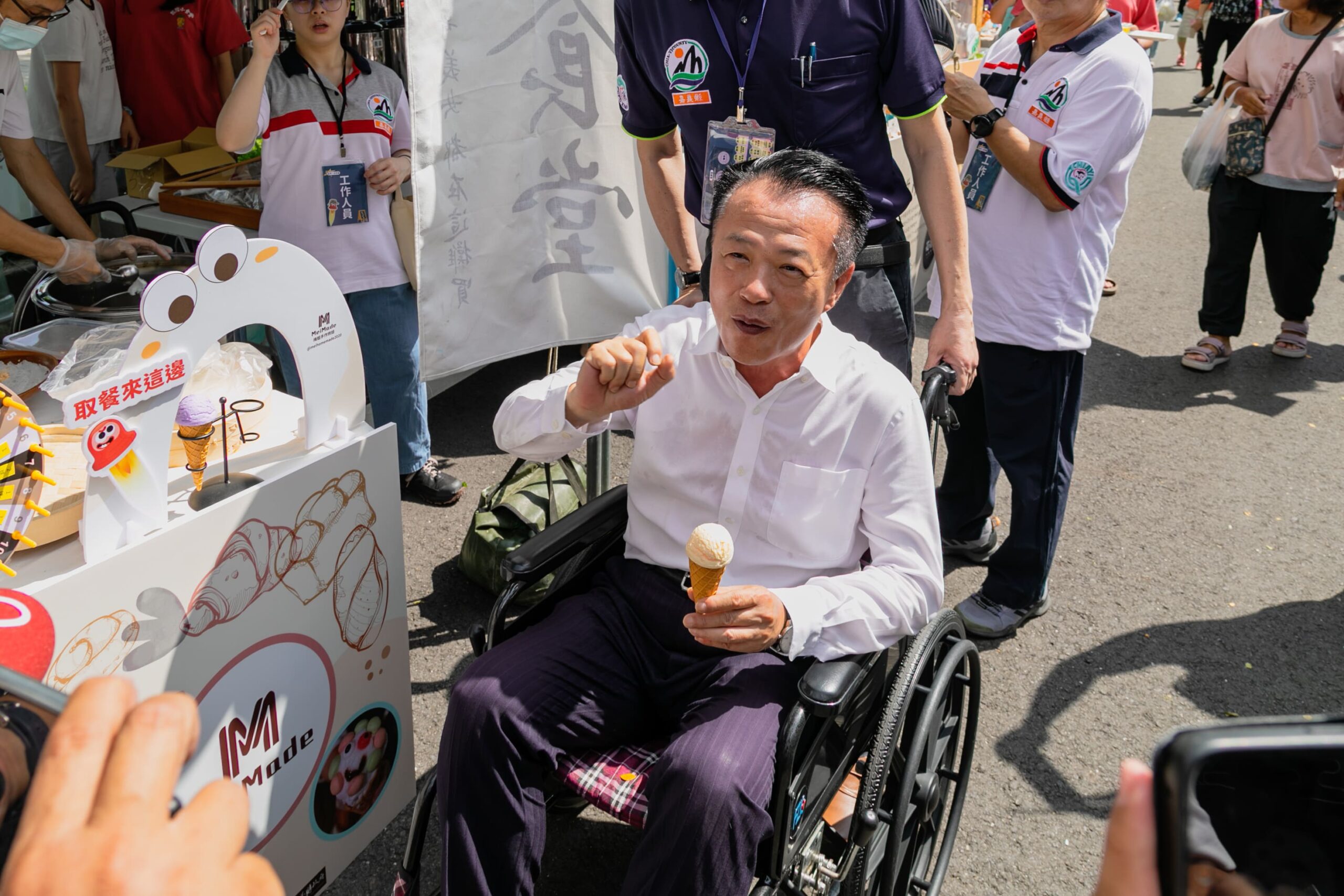 另一大特色是「友ㄞˋ小宇宙」身障友善服務專區,設置30個攤位,以通用設計與去標籤化理念,打造無障礙消費環境。視障者可透過嗅覺選購精油皂,聽障者能藉燈號辨識餐點,認知障礙者則能利用圖示卡牌理解餐點內容。翁章梁現場也親身坐上輪椅,體驗友善市集的便利性,並強調「身障友善必須融入日常,社會才能更理解與支持」。