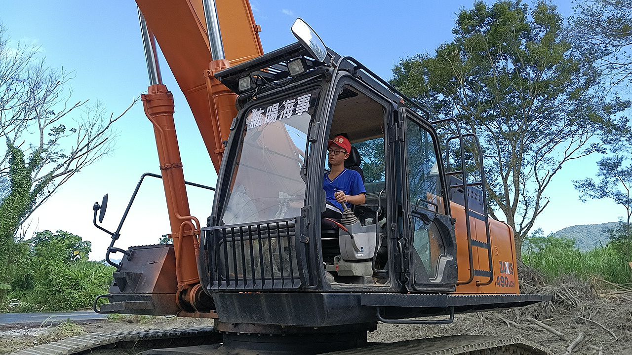 ▲東億海事工程董事長游清河的15 歲外孫楊承勳剛取得怪手技術士執照,馬上加入災行列。