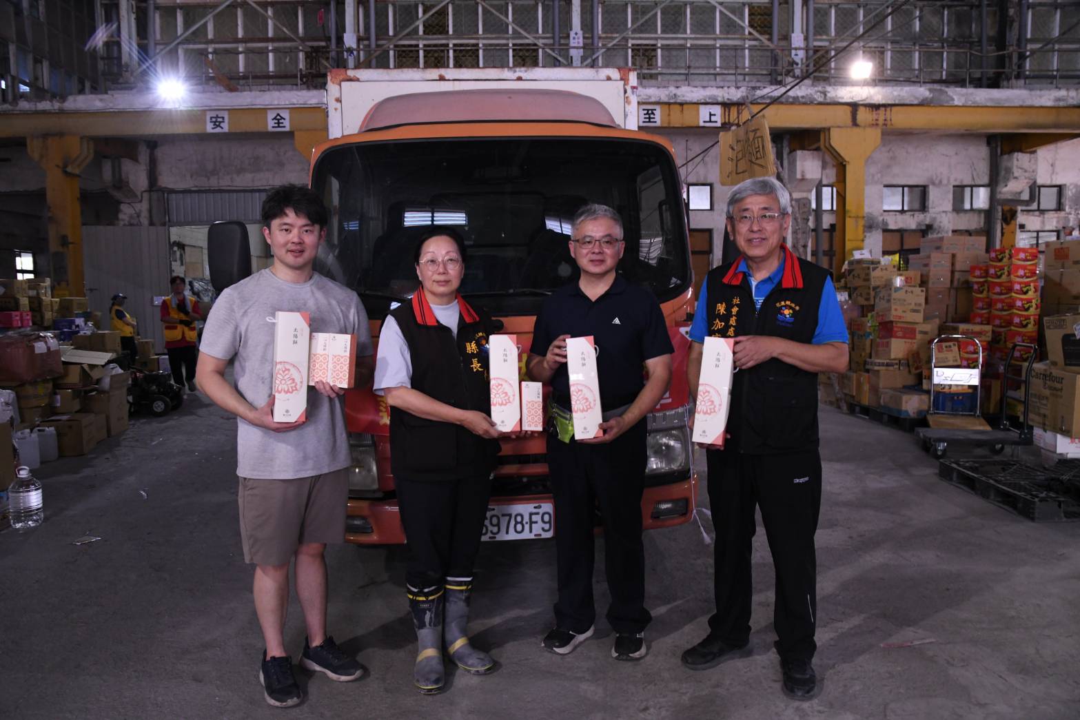 ▲陳允寶泉老闆陳宇鴻(右二)捐贈1600份太陽餅,花蓮縣長徐榛蔚(左二)頗為感動。動