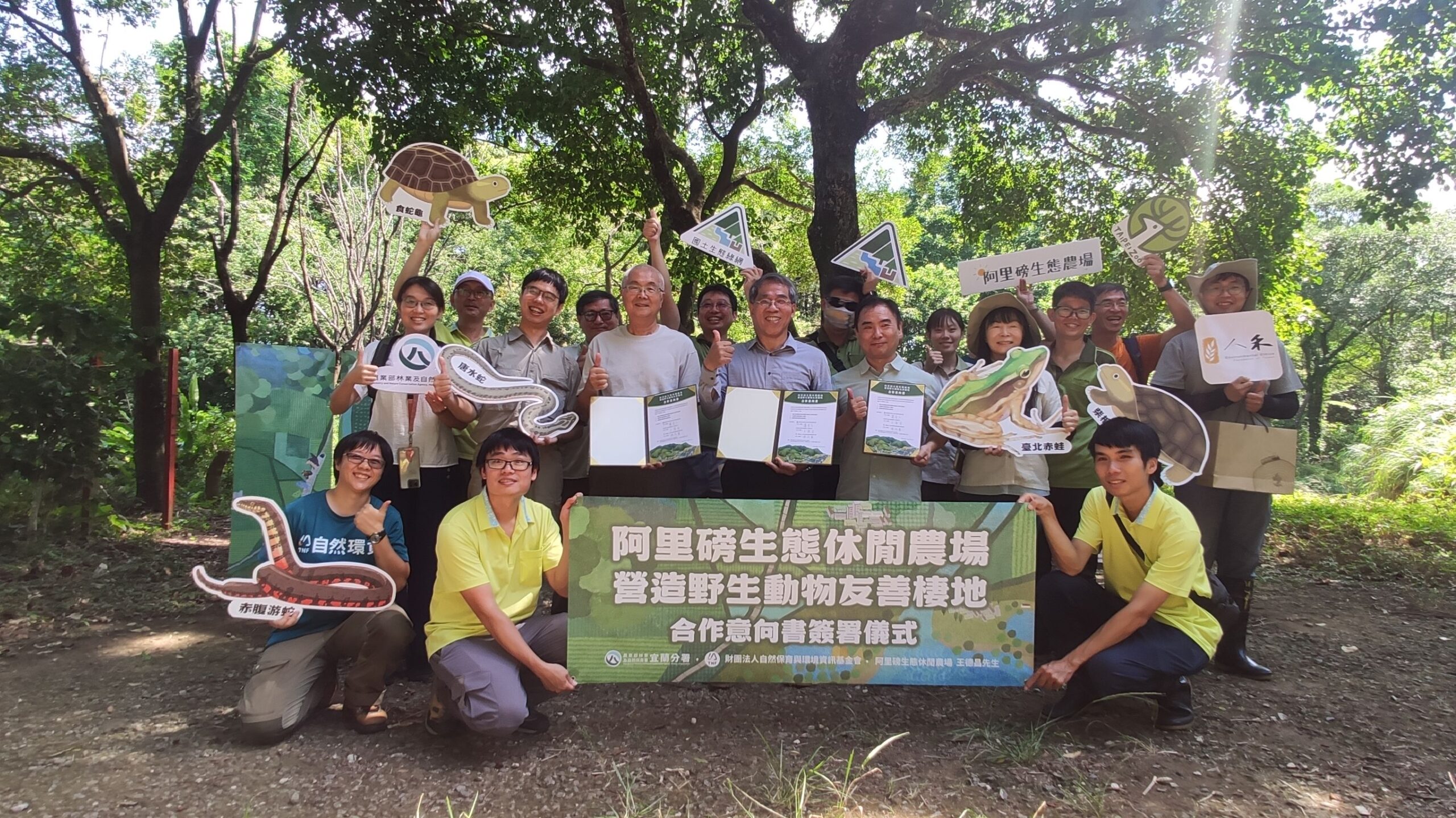 守護原生物種棲地、深化對珍貴稀有原生兩棲類—臺北赤蛙(Hylarana taipehensis,又名「雷公蛙」)的保育行動,林業及自然保育署宜蘭分署30日與阿里磅生態休閒農場地主代表王德昌及財團法人自然保育與環境資訊基金會,共同簽署「阿里磅生態休閒農場營造野生動物友善棲地」合作意向書。