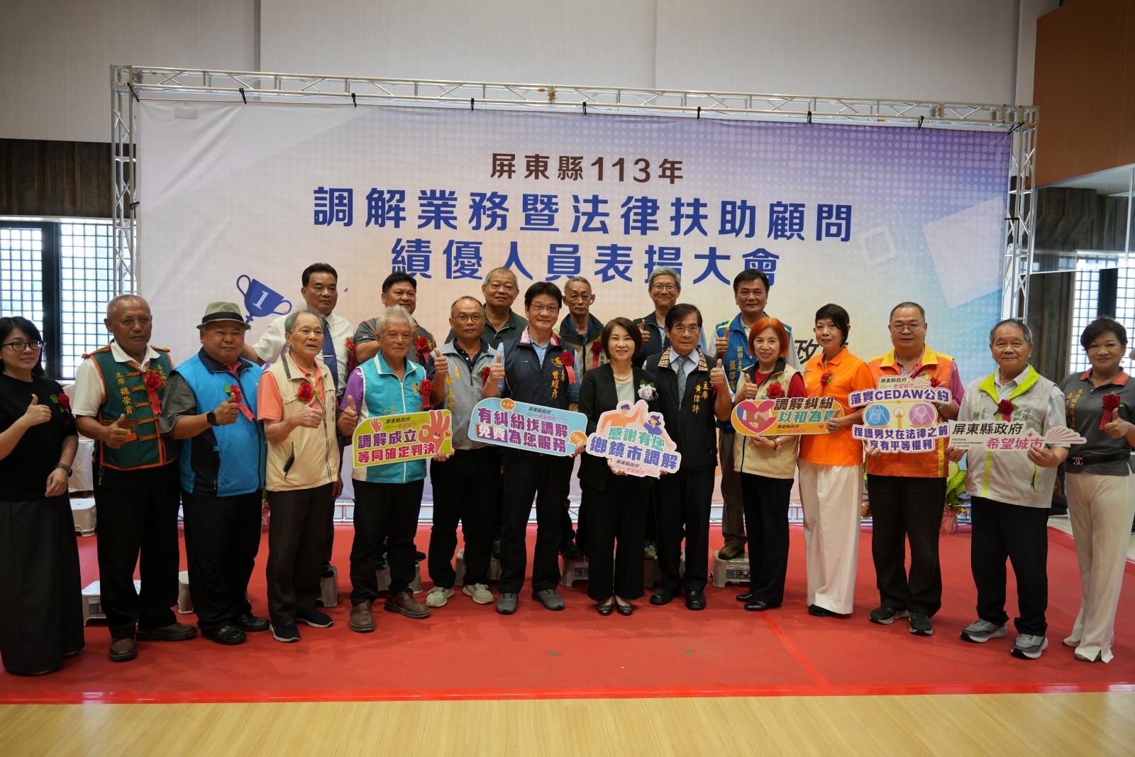 【記者戴英薇/屏東報導】 為感謝調解委員及法律扶助顧問、志工為縣民排解紛爭或法律疑難雜症,屏東縣政府今(30)日在縣府大禮堂舉辦「屏東縣113年鄉鎮市調解及法律扶助業務績優人員表揚大會」,共計26個績優單位及105名績優人員獲獎,其中屏東市公所受理案件數最多、萬丹鄉公所調解成立率最高,縣長周春米一一頒獎祝賀,致上無限的謝意。