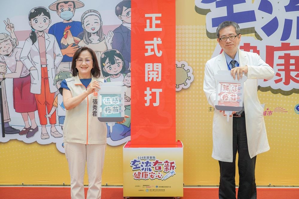 【記者戴英薇/屏東報導】 114年度公費流感疫苗及新冠疫苗開打,屏東縣政府衛生局同步於屏東榮民總醫院舉行「114年度流感及新冠疫苗開打記者會」,即日起全縣33家衛生所及各合約醫療院所皆提供符合公費資格者接種,縣府已整合各醫療院所人力,備足疫苗存量,呼籲民眾踴躍接種,提升自身免疫力,共同維護社區健康。