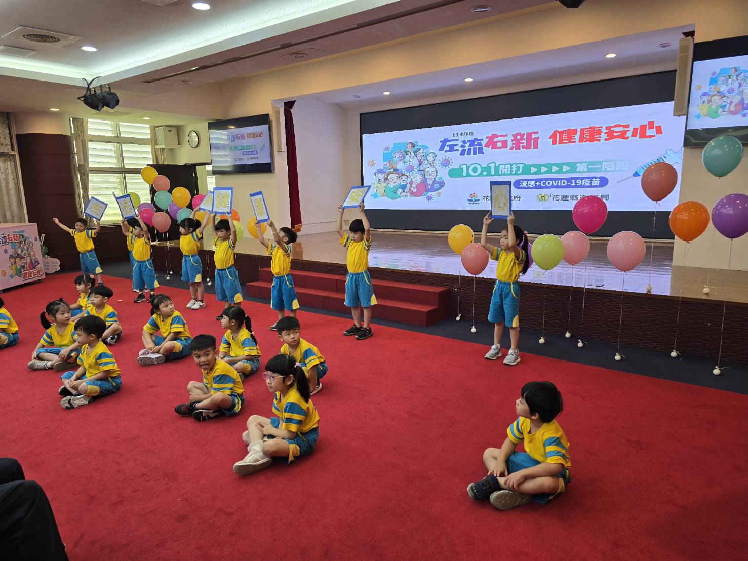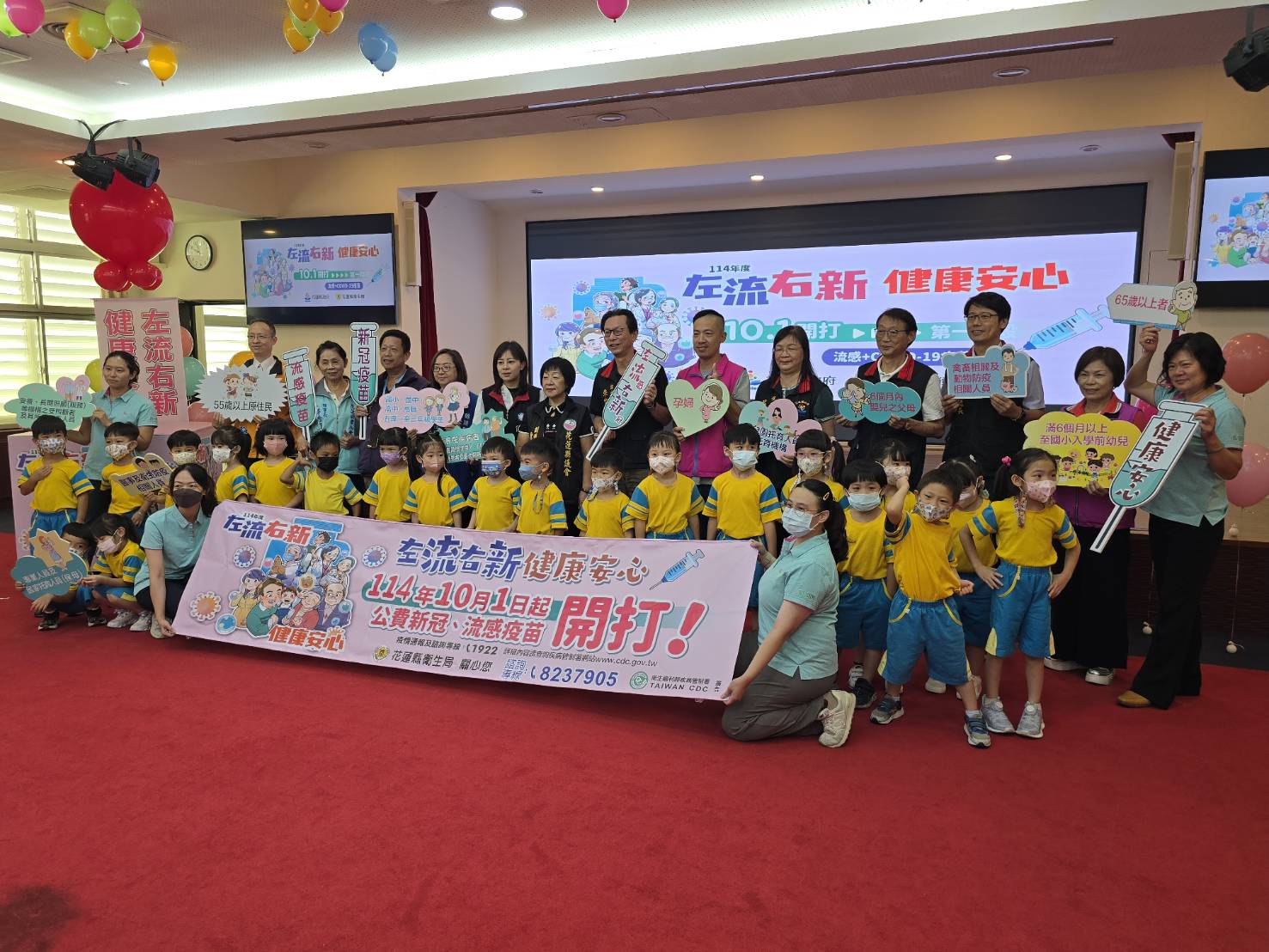 ▲花蓮縣衛生局提醒,流感與新冠疫苗可同時接種(左流右新),獲得雙重保護。小朋友也高舉【左流右新 健康安心】的標牌呼應。