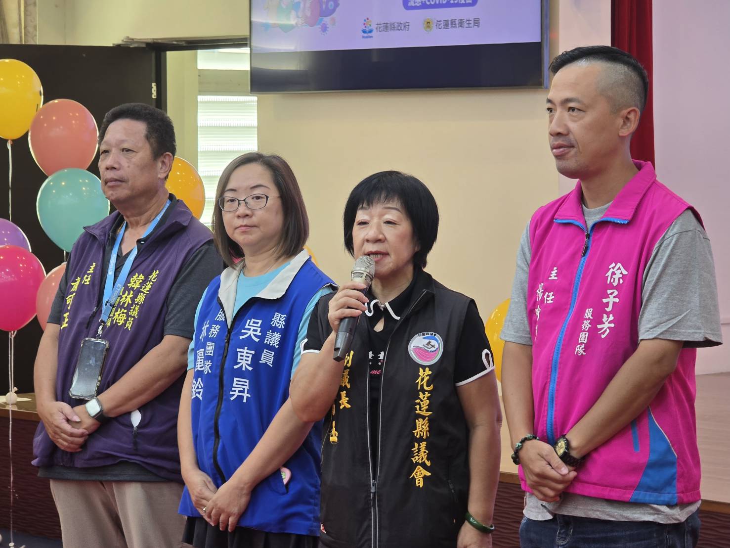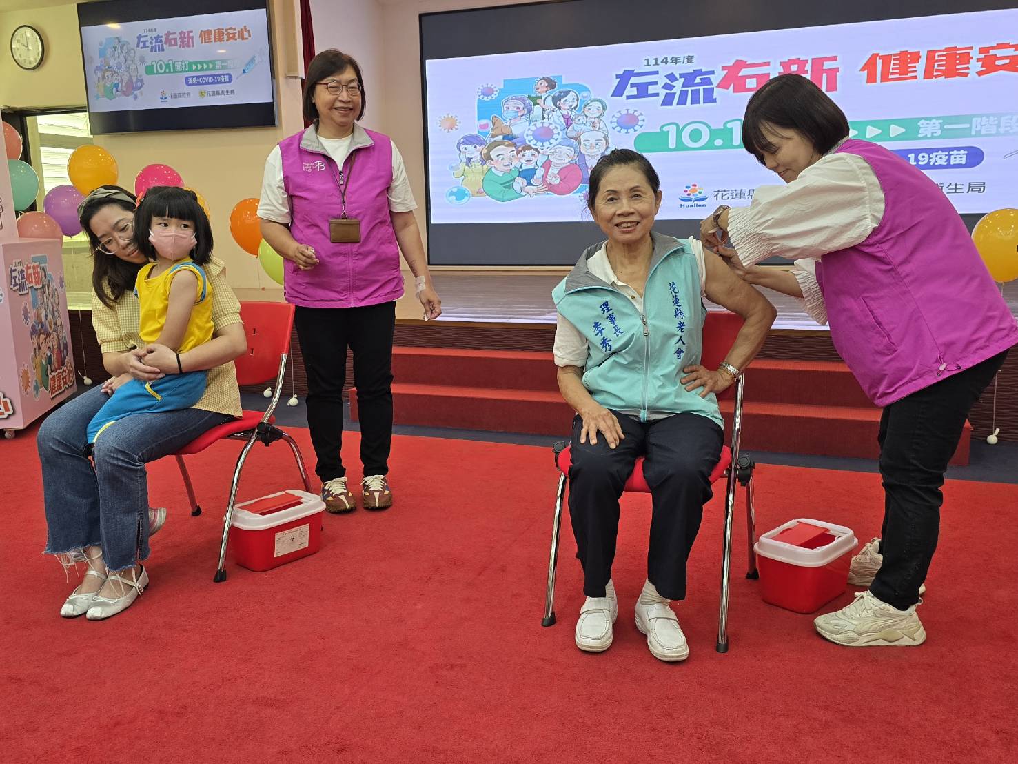 記者會中,先由花蓮縣老人會理事長李秀玉、明勤幼兒園蘇姓小朋友示範接種疫苗,隨後,一群老少依序排隊接種,縣府政風處長唐文彬、財政處長唐文彬、地方稅務局長呂玉枝、花蓮市婦女會理事長游淑賢、前理事長江如玲、花蓮縣老人會前理事長高明星等人紛紛挽袖接種,場面熱絡。