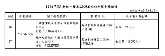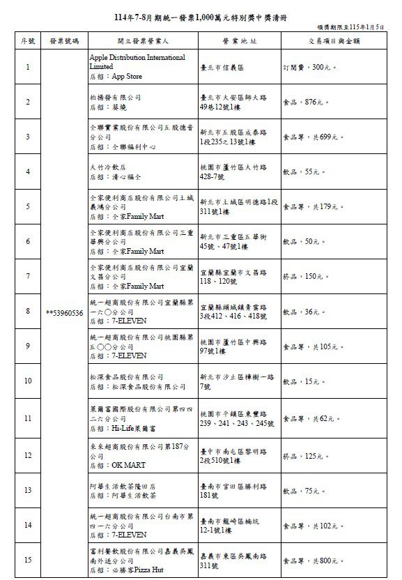 ▲114年7-8月期統一發票1,000萬元特別獎中獎清冊。圖/財政部賦稅署