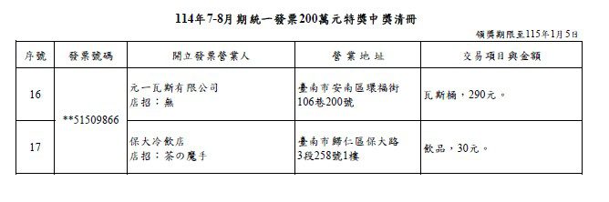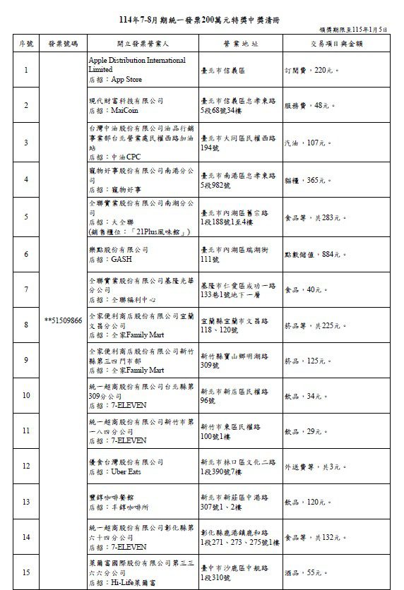▲114年7-8月期統一發票200萬元特獎中獎清冊。圖/財政部賦稅署
