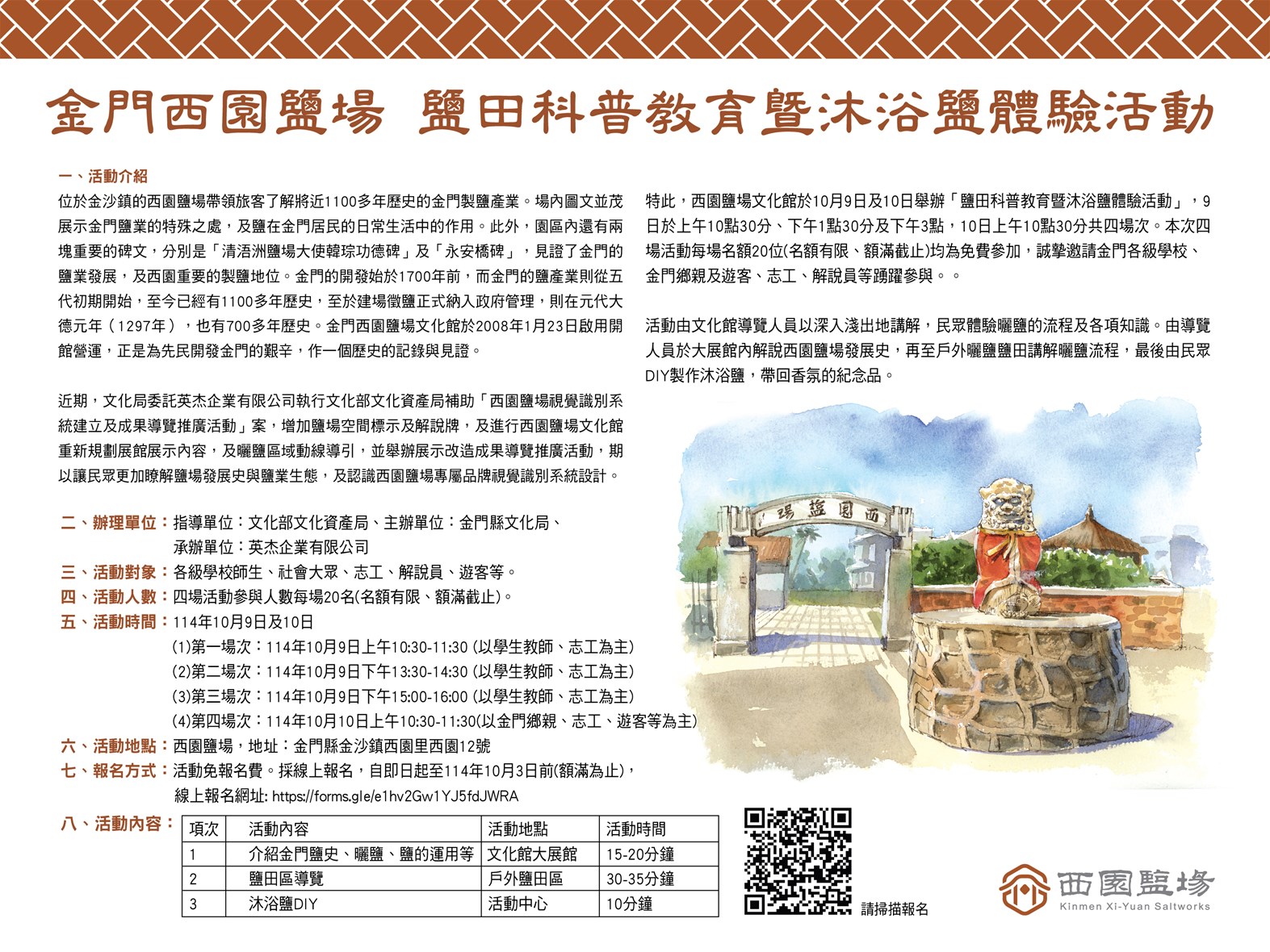 特此,西園鹽場文化館於10月9日及10日舉辦「鹽田科普教育暨沐浴鹽體驗活動」,9日於上午10點30分、下午1點30分及下午3點,10日上午10點30分共四場次。本次四場活動每場名額20位(名額有限、額滿截止)均為免費參加,誠摯邀請金門各級學校、金門鄉親及遊客、志工、解說員等踴躍報名參與。活動聯絡電話:英杰企業有限公司 邵小姐(02)2732-1234,報名方式:採線上報名,自即日起至114年10月3日前(名額有限、額滿截止),線上報名網址: https://forms.gle/e1hv2Gw1YJ5fdJWRA