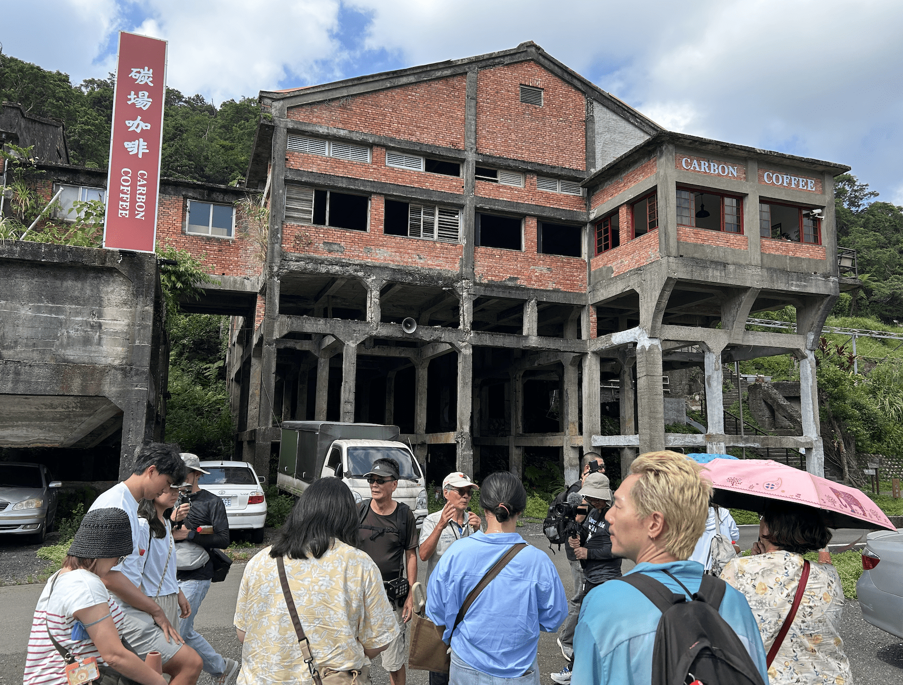午後,我們來到菁桐的煤礦遺址「石底大斜坑」。導覽員一邊講述礦工生活,一邊帶著我們走進百年坑道,氣氛莊重又充滿故事。看著斑駁石牆與蒼老大樹交織,真的像走進一部時光電影。
