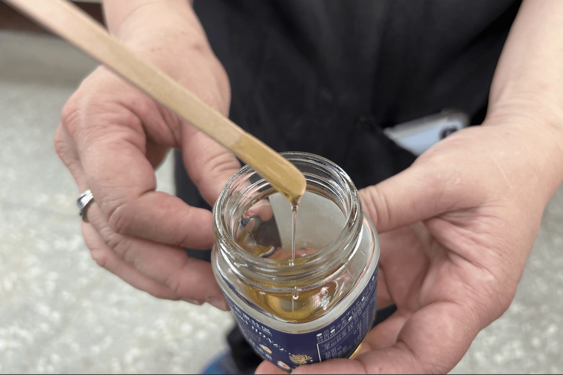 ▲蜂蜜緩緩滴落,金黃色的光澤很吸睛。(圖/記者 黃俊育 攝)