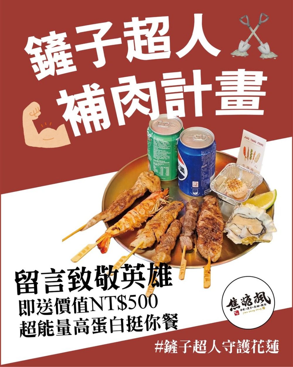 台灣人氣串燒第一品牌「焦糖楓」再度展現公益熱忱,宣布力挺「鏟子超人」。即日起至10月10日止,民眾只要在焦糖楓官方Facebook平台內「鏟子超人補肉計畫」貼文下方留言指定關鍵字,並上傳救災照片和加入官方活動帳號,即可免費獲得價值超過500元的「花蓮超能量高蛋白挺你餐」,以美味行動為救災英雄加油打氣。