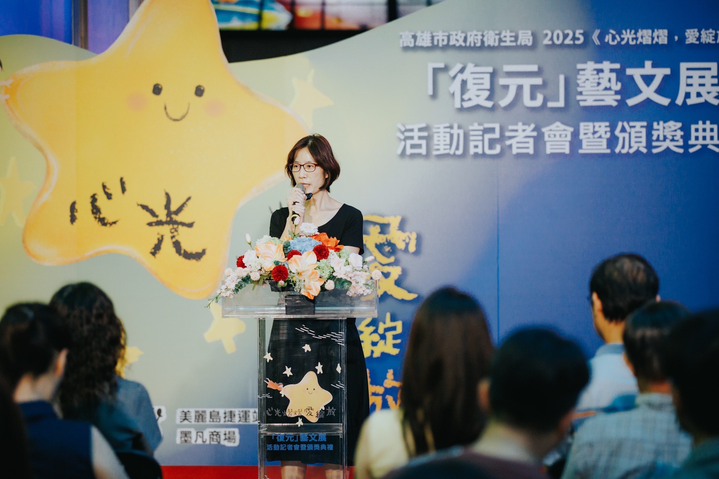 ▲高雄市政府衛生局王小星副局長,為「心光熠熠,愛綻放—復元藝文展」致詞,感謝與會貴賓蒞臨與指導。(圖/高雄市衛生局提供)