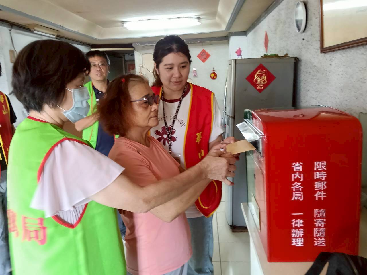 70歲的張阿嬤經濟拮据,生活仰賴政府補助,與身障前夫相依為命。多年前痛失愛子後,一直沉浸在悲傷中;一個月前又因心肌梗塞緊急送醫,裝上心臟支架,生活更加困難。華山站長與義工平日定期到宅關懷,提供物資與陪伴,協助她走過孤單。高雄郵局蔡碧惠副科長得知阿嬤的狀況後,號召同仁於中秋節前夕送關懷禮到阿嬤家,希望能帶給她溫暖與力量。本日蔡副科長特別準備一座郵筒,陪伴阿嬤將對兒子的思念化為文字,親手投遞,象徵將這份心意寄送至天際,為她帶來心靈慰藉。