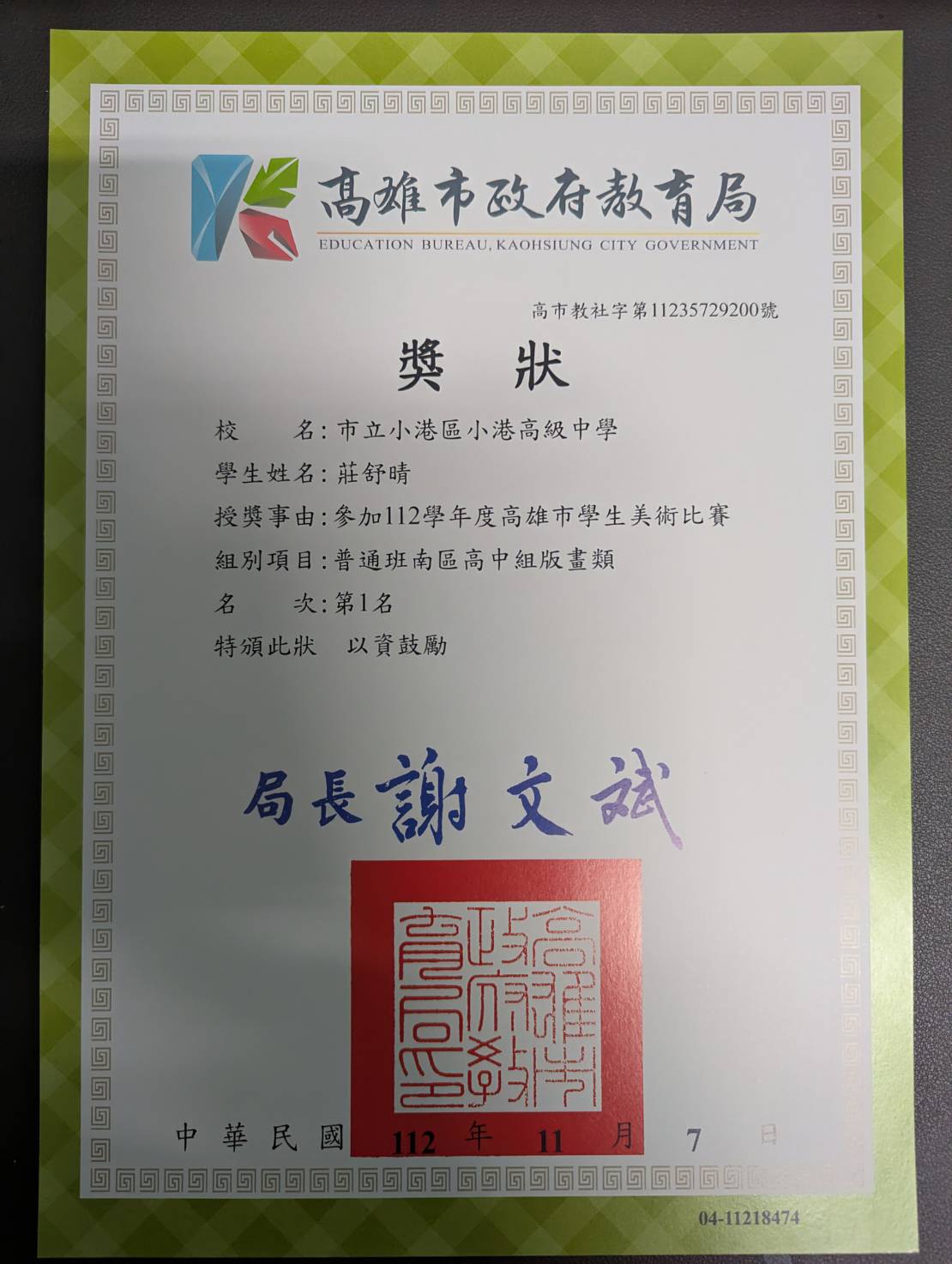 照片2-2 : 莊舒晴參加「112學年度高雄市學生美術比賽」普通班南區高中組版畫類「第一名」獎狀