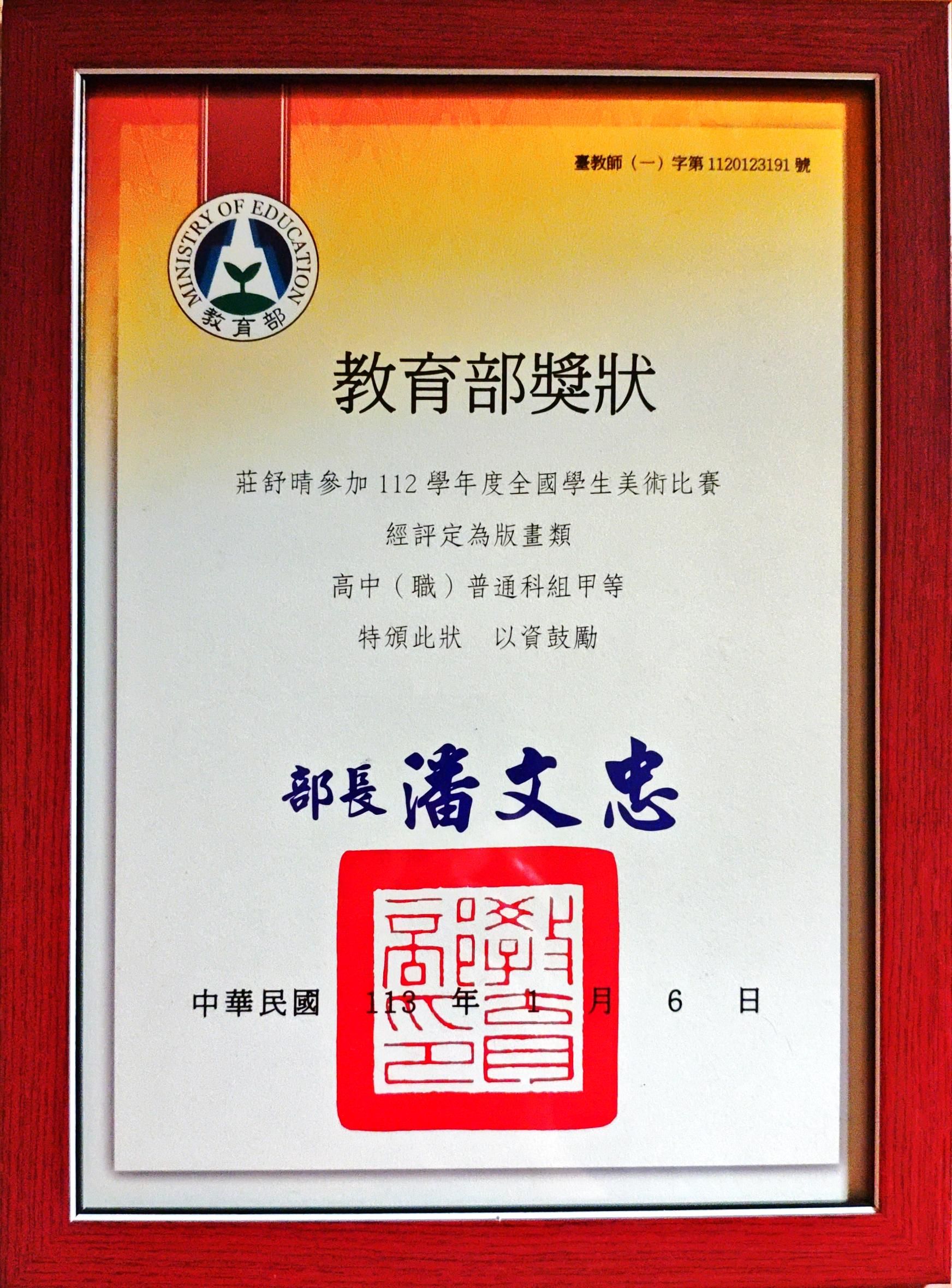 照片2-3 : 莊舒晴參加「112學年度全國學生美術比賽」高中(職)普通科組版畫類獲「甲等獎」教育部獎狀
