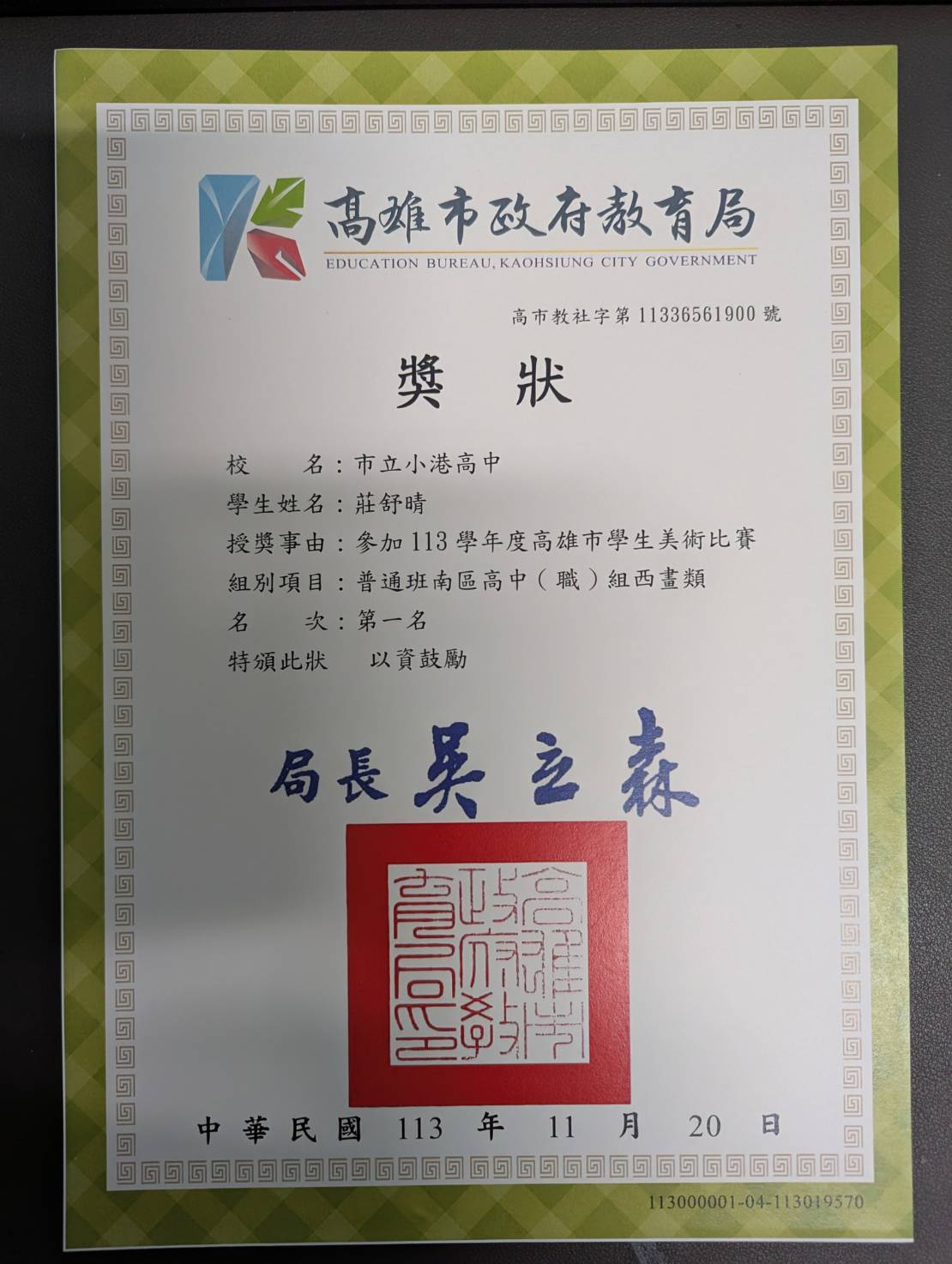 照片1-2 : 莊舒晴參加「113學年度高雄市學生美術比賽」普通班南區高中組西畫類獲「第一名」獎狀