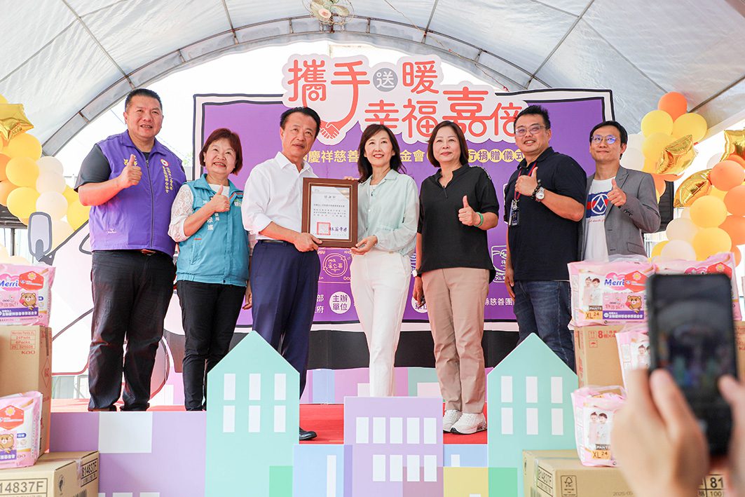 全聯慶祥慈善事業基金會愛心捐助不間斷,攜手嘉義縣物資銀行為嘉義縣弱勢家庭送暖。7日在全聯福利中心六腳蒜頭店舉辦捐贈儀式,嘉義縣長翁章梁代表感謝基金會並頒發感謝狀,由基金會執行長張宜君代表接受。