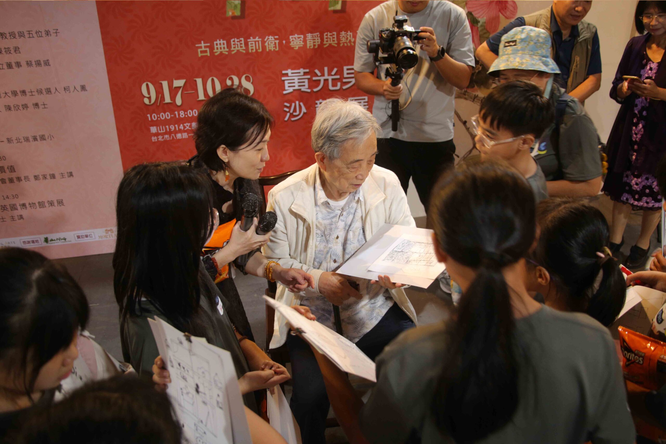 孩子們不但先深情地朗讀畫裡的詩句,在黃館長弟子高駿華博士的指導下,並嘗試臨摹館長經典的「窗外系列」作品,創作屬於自己的小小作品。黃光男親切地分享童年故事,提醒孩子:「要學會觀察自然的細節,這些小發現將成為你生命中最珍貴的養分。」一場跨越年齡、充滿童趣的「待用課程」藝術陪伴與體驗,就此在展場展開。
