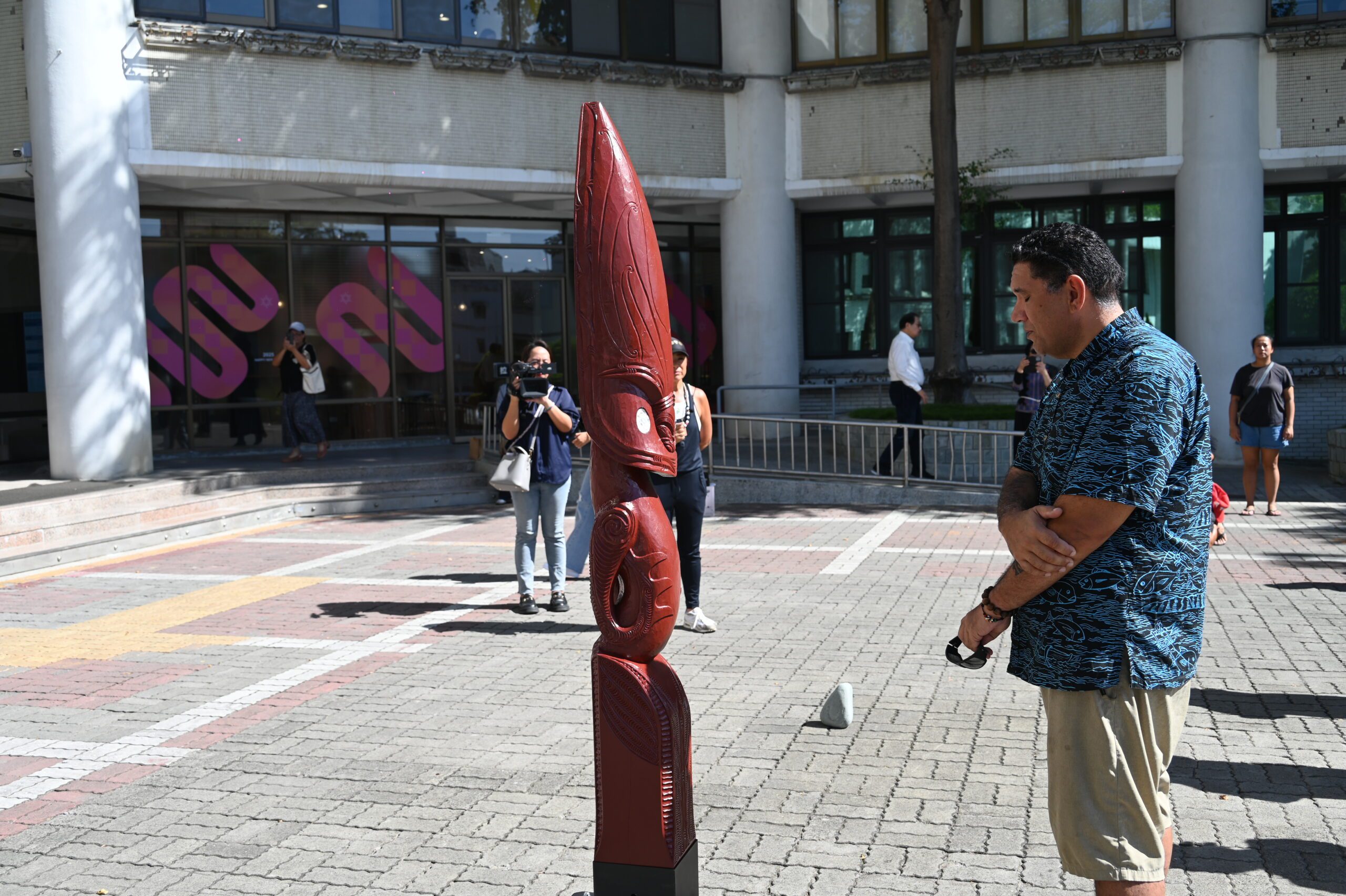 活動先由臺東縣南島支架大洋州航海協會理事長江伊茉說明星空羅盤「Pou Haere」的文化背景與象徵意義,並由 Eruera進行吟唱與祝禱祈福,隨後以毛利傳統「hongi 碰鼻禮」完成祝禱。Eruera亦邀請縣長共同進行「碰鼻禮」,象徵尊重、友誼與文化的連結,並表達對南島文化交流的肯定與祝福。江伊茉說,臺東活水湖於10月4日啟動全臺首座星空羅盤雕刻柱,「Pou Haere」源自毛利語,其中「Pou」意指「柱子」,「Haere」則為「行走、旅程」之意。此次由毛利雕刻工藝師於公東高工製作完成的星空羅盤雕刻柱,象徵航海智慧與星辰指引,承載南島民族跨越海洋、延續知識與文化的深厚意涵。