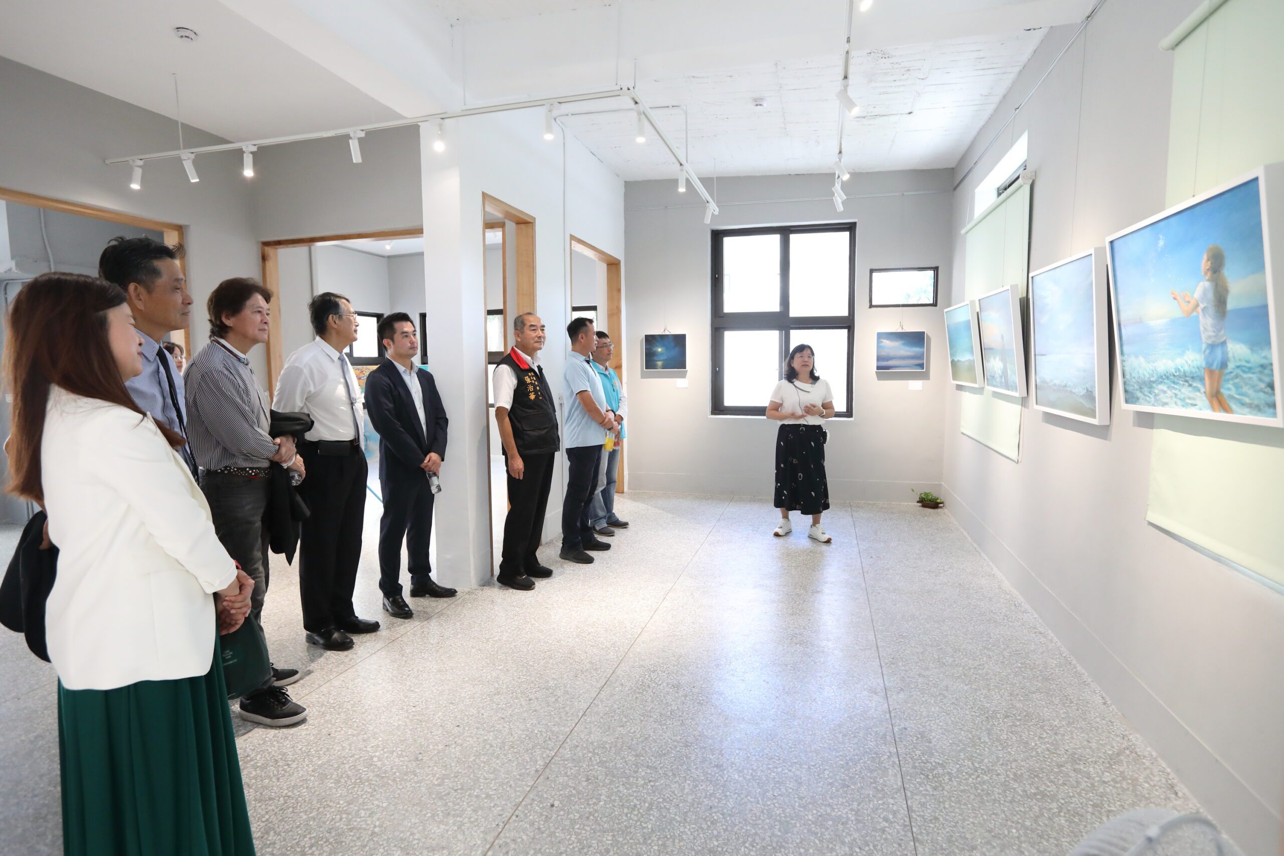▲傑出校友等人觀賞退休老師戴莉如油畫展,由戴老師親自導覽。