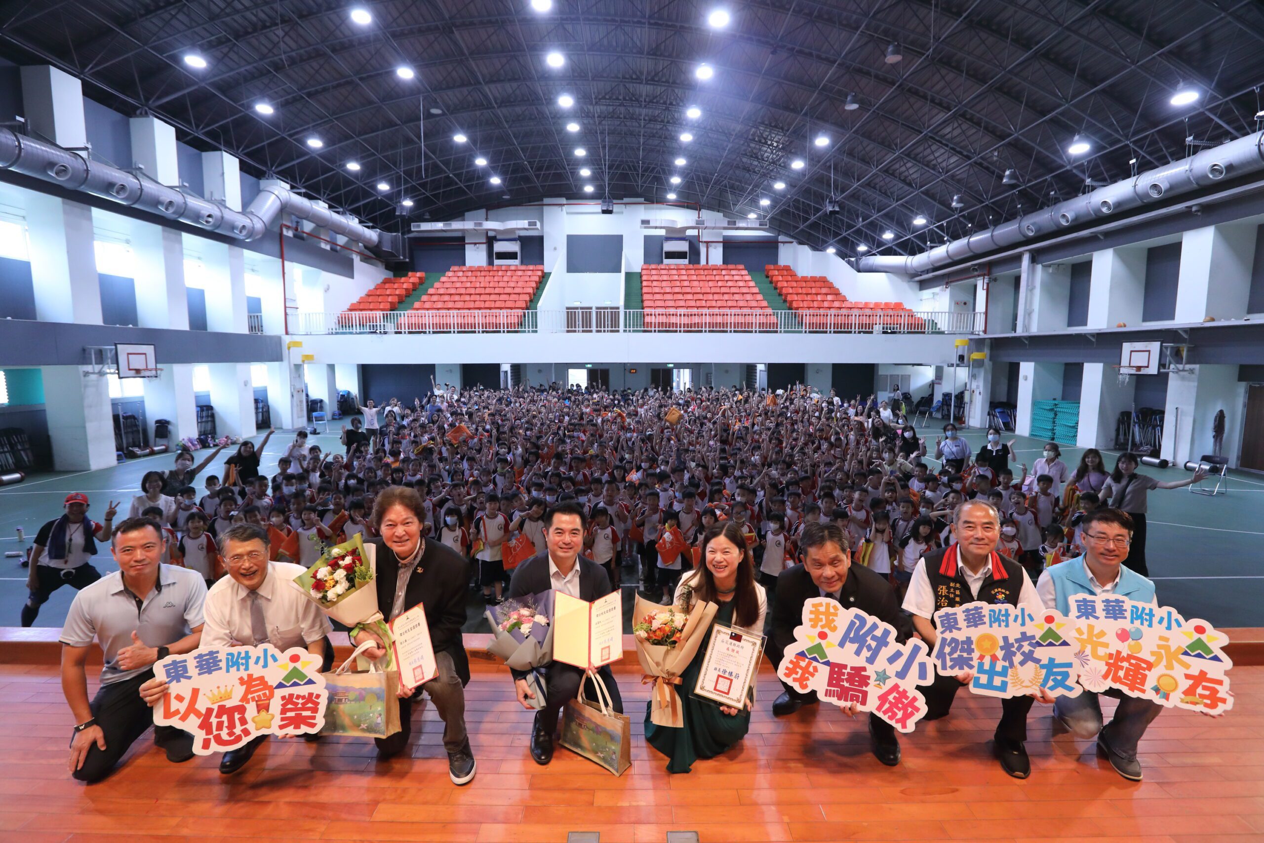 國立東華附小今年創校76週年校慶,遴選出第二屆「傑出校友」,並在全校兒童週會中舉行簡單不失隆重的頒獎典禮,全校800多位師生觀禮,深深祝福。