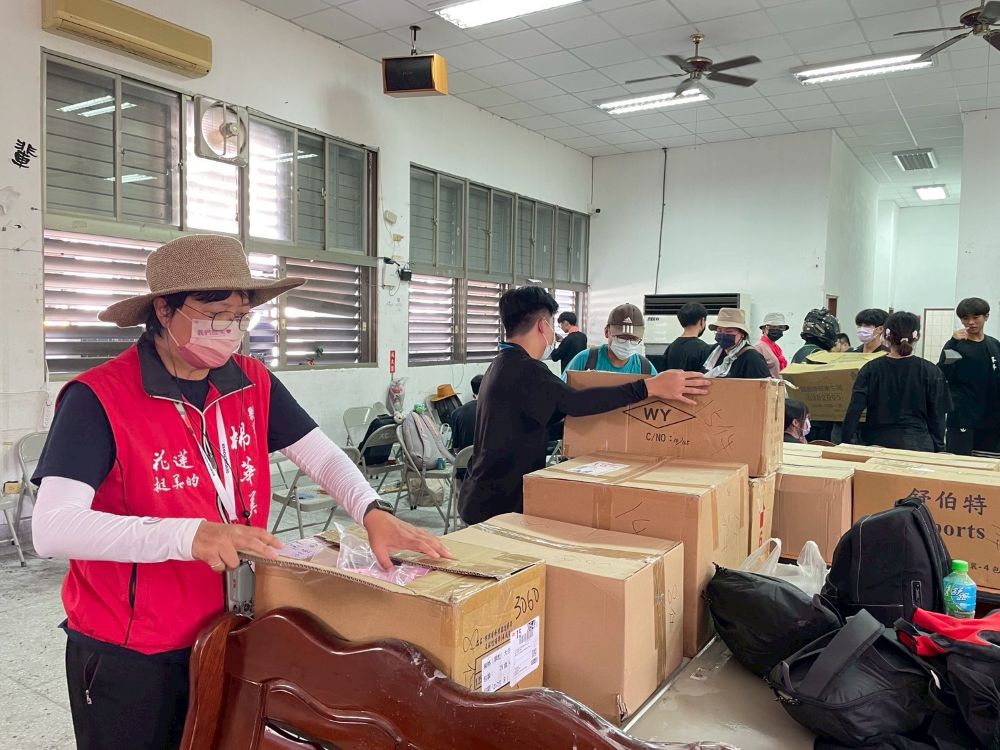▲花蓮縣議員楊華美(左一)率志工群發放災民「護你包」。