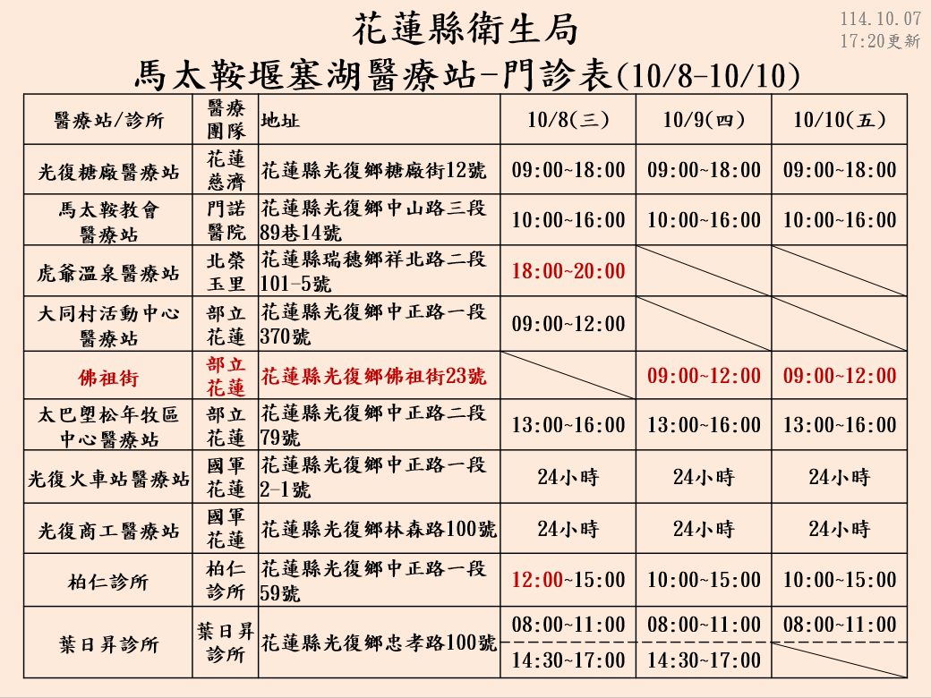 衛生局副局長鍾美珠說,截至昨天,流感疫苗施打已達962人次,新冠疫苗330人次。請光復鄉民、志工及救災人員儘快施打流感疫苗,有症狀者也應配戴口罩。大進國小及馬太鞍教會設有心理諮詢站,提供創傷症候群心理輔導,歡迎災民利用,另,馬太鞍堰塞湖醫療站新增佛祖街23號站點,服務時間為上午9時至12時。