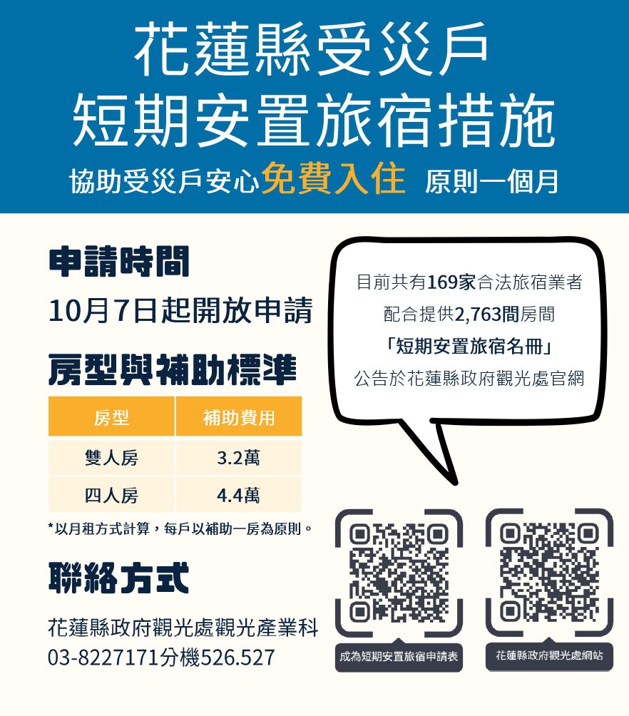 花蓮縣政府今(8)日召開馬太鞍堰塞湖潰壩救災進度說明會,由行政暨研考處長陳建村主持。縣府強調,10月7日起開放災區短期安置旅宿申請,觀光處網站公布169家配合業者,共提供2763間各類房型,雙人房每月補助3萬2千元,四人房每月補助4萬4千元,每戶補助一房為原則,請鄉親善加利用。