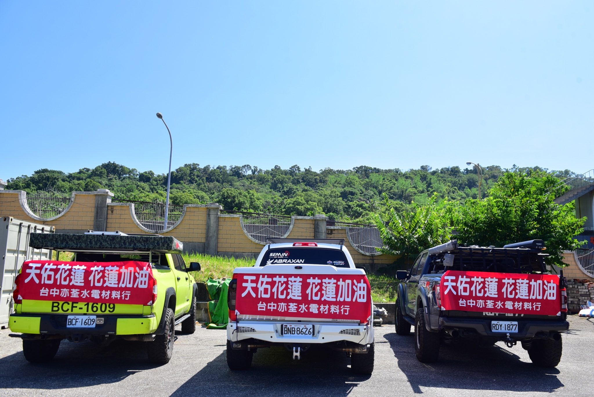 ▲台中愛心水電材料行掛著【天估花蓮 花蓮加油】的醒目紅布條,今天車隊駛抵花蓮。