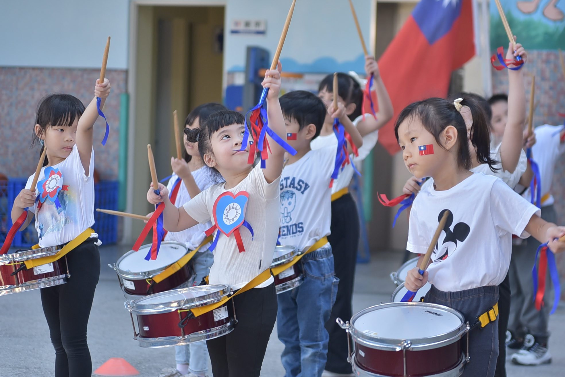 活動一開始,幼兒園各班依序整隊進場,模仿「三軍」分列式;中一班組成直排輪隊,中二班則是滑步車隊,中三班展現跆拳道英姿,大班幼兒則高舉國旗隨車進場,場面熱鬧,宛如迷你版的閱兵典禮。隨後,全體小朋友齊唱國歌,並舉行升旗儀式。老師們透過戲劇演繹國慶日的由來與故事,讓孩子們更直觀了解「青天白日滿地紅」的意涵。
