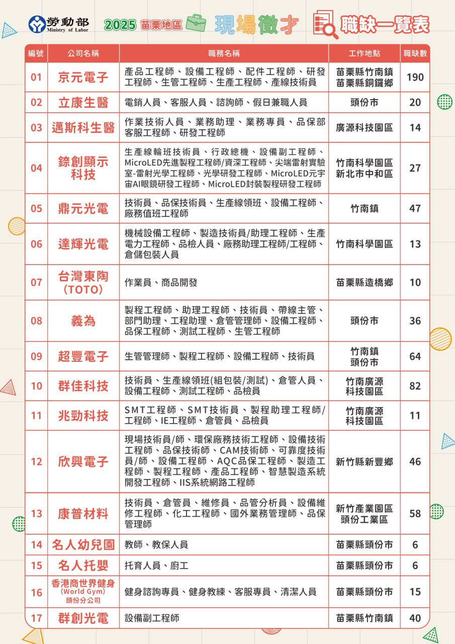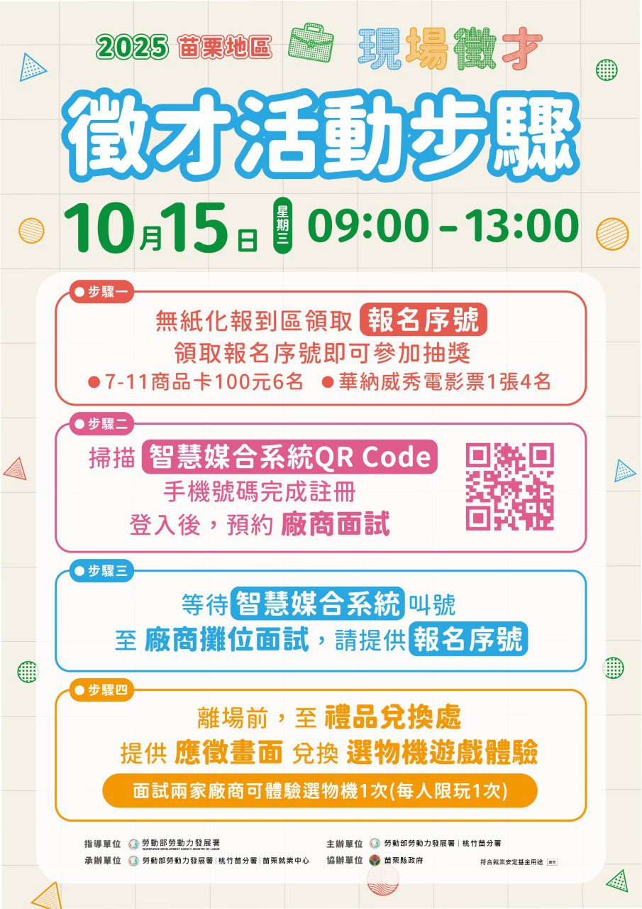 【記者戴英薇/苗栗報導】 為協助求職者拓展就業管道並順利就業,同時協助企業延攬合適人才,勞動部勞動力發展署桃竹苗分署將於 10月15日(星期三)上午9點至下午1點,在竹南科學園區行政服務中心2樓(苗栗縣竹南鎮科研路36號) 舉辦「苗栗地區現場徵才活動」。邀請17家廠商,釋出近700個優質職缺,逾八成起薪33K以上,涵蓋半導體、光電、生醫、傳產、教育及休閒運動等多元產業,為不同需求的求職族群打造豐富選擇。為響應環保,本次活動採用無紙化報到,完成報到即可參加抽獎,有機會抽中超商禮券及電影票,讓找工作兼拿好禮,一舉兩得!