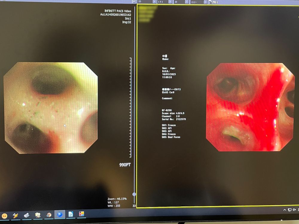 楊朝能回憶,第一次清理時,宛如為肺部「清淤」,從病人的鼻咽、喉咽,一路到左右支氣管,都堆積了大量濃痰與泥沙,團隊在不傷害呼吸道的情況下,盡可能移除細沙,考量殘留泥沙會隨分泌物逐步排出,一週後再次進行第二次支氣管鏡檢查與清理,這時從支氣管鏡檢查中,可以看出氣管已明顯乾淨許多,濃痰與泥沙大幅減少,黏膜也開始修復,患者呼吸狀況大幅改善。