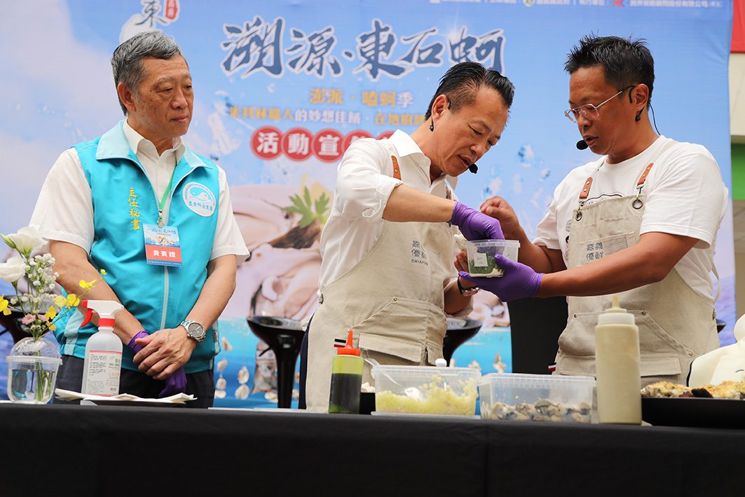 翁章梁在記者會上除了與業者進行說菜SHOW對談,也在蔡易達主廚指導下製作蚵料理,品嘗最鮮甜的好滋味。他說來嘉義東石、布袋搭配活動吃蚵,消費滿額就可以得到限量卡哇伊的蚵寶包公仔,另外商圈購物節滿200就有抽中越野車、露營車的機會,來嘉吃喝玩樂大利多。