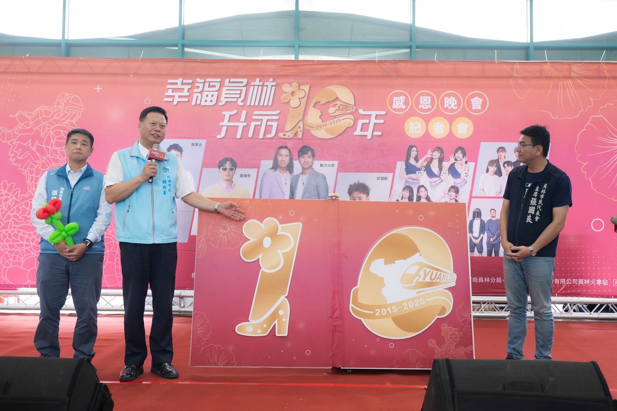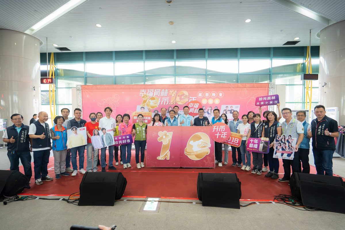 為慶祝員林鎮升格為員林市滿十週年。市公所將於10月18日(星期六)晚間6時在「圓林園生態滯洪池」舉辦「幸福員林.升市十年」感恩晚會,慶祝員林升格為市滿十週年。今(9)日上午在員林市火車站大廳舉辦「幸福員林.升市十年」宣傳記者會,員林市代理市長賴致富、縣府機要秘書張建豐、民政處副處長陳俊男、秘書賴沛然、游筑凱及員林市民代表會主席張國良、副主席江憲政及多位市民代表、彰化縣議員張錦昆、凃俊任、劉惠娟、張欣倩及詹木根等、以及縣府長官、立法委員等嘉賓及地方仕紳共同宣布此消息,邀請全國民眾來員林抽大獎、看表演、品美食,共度豐收閃耀的夜晚。