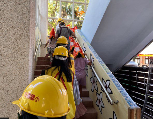 ▲小朋友演練到建築物高處或學校周邊地勢高處避難。