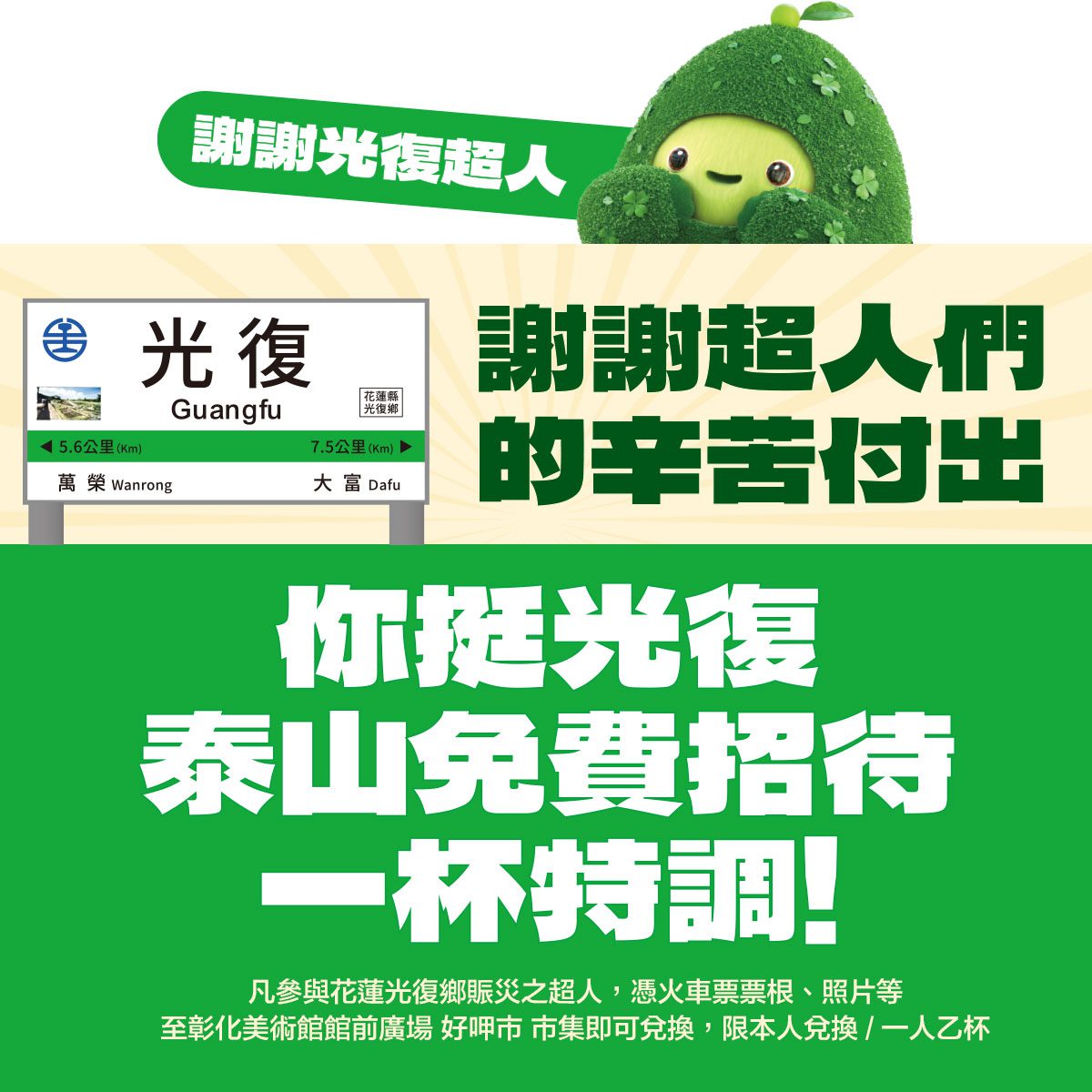 除了內容豐富的攤位活動外,泰山食品也特別推出「謝謝光復超人」回饋方案。凡參與花蓮光復鄉賑災之志工與英雄們,憑火車票票根或參與照片,即可於現場免費兌換一杯特調飲品,限本人兌換,一人乙杯,藉此向辛苦付出的超人們致上最誠摯的感謝。