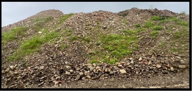 3▲[美濃溪埔寮大峽谷王]:被盗挖肚腸中細砂石 堆積雨淋日曬如山高 等待日後鋏綿賣建築