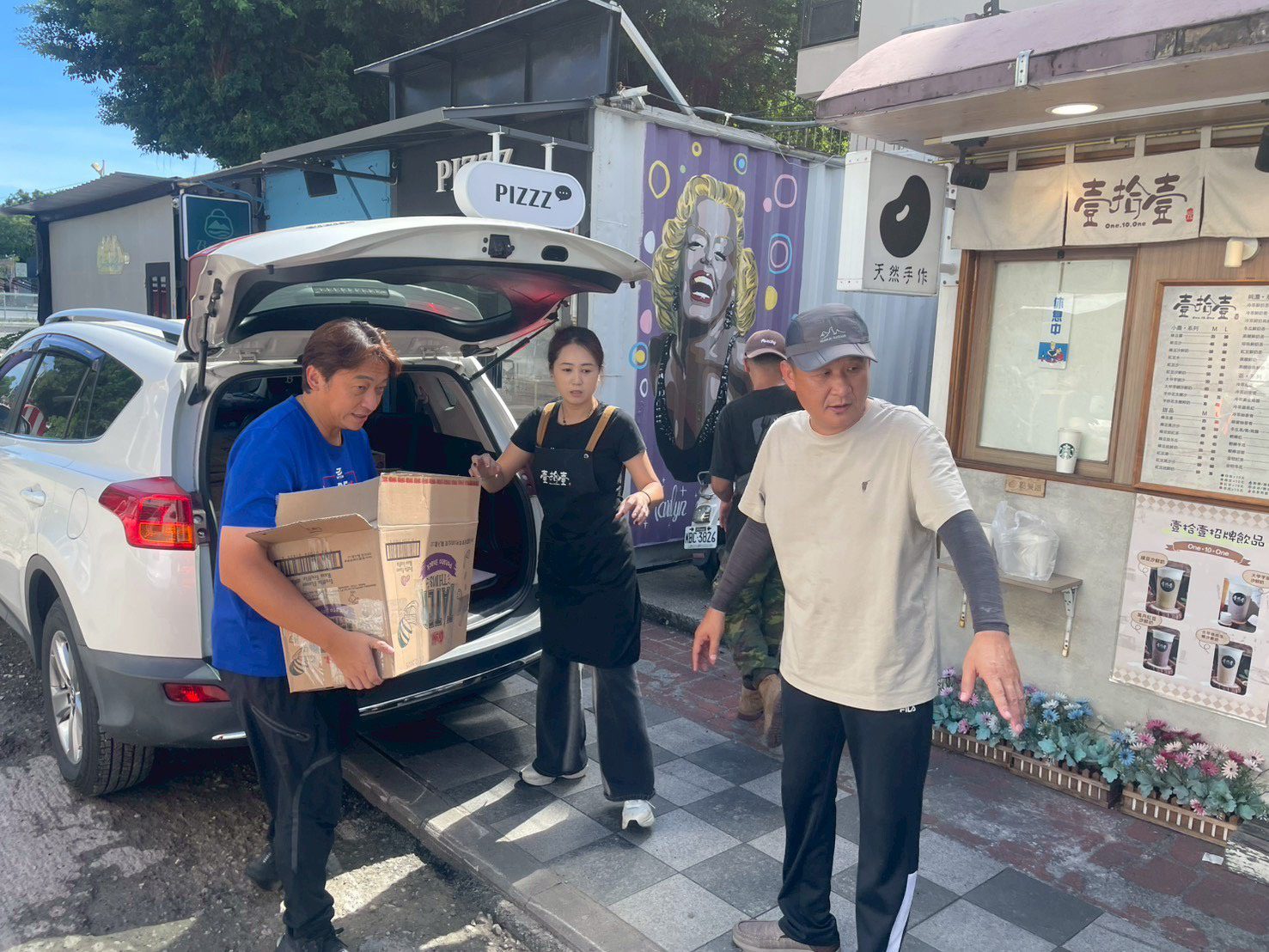 ▲縣議員魏嘉賢(左)攜手壹拾壹飲料店老闆魏蓁蓁(中)為災區送暖。(圖/魏嘉賢服務處提供,下同)