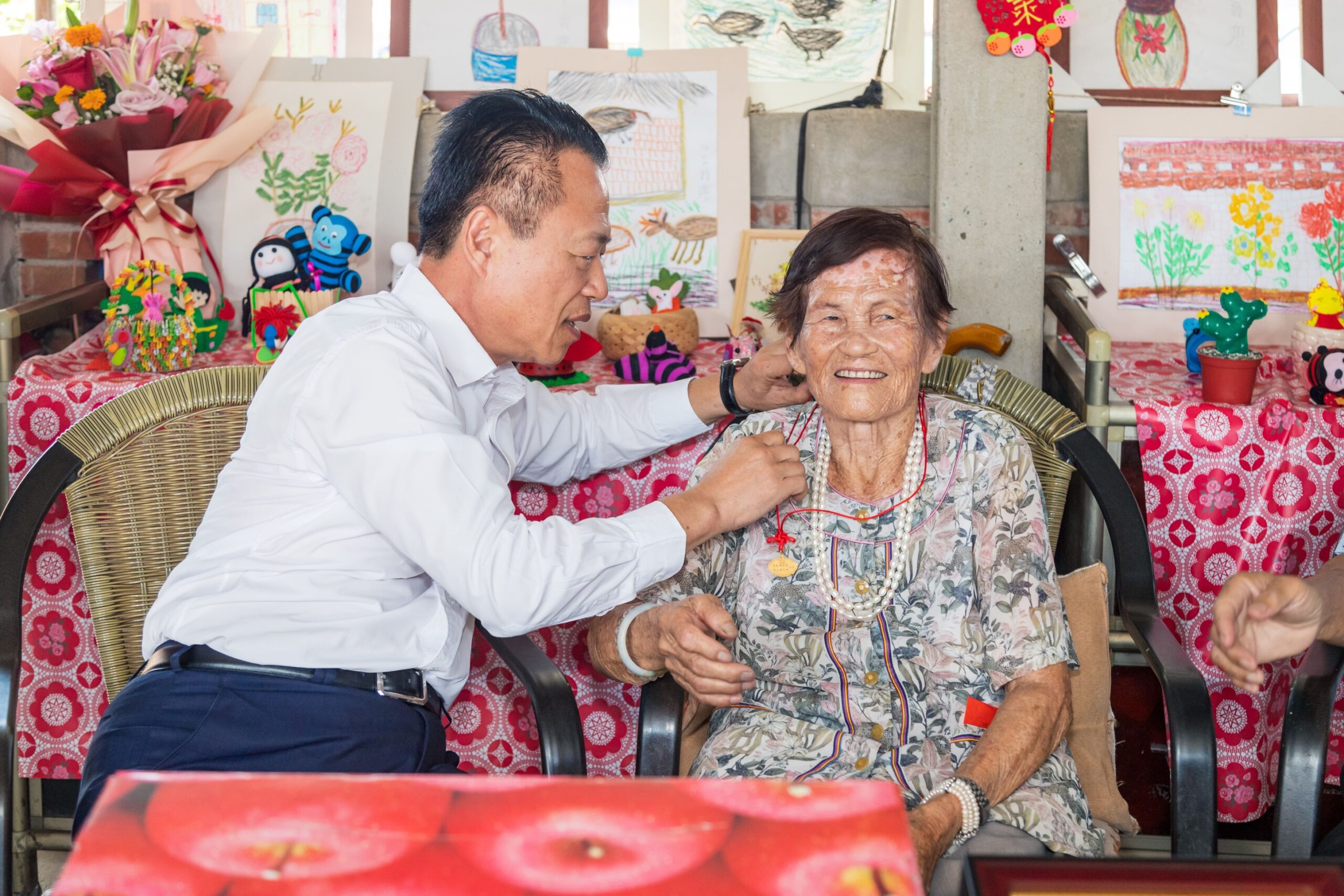 嘉義縣今年共有127位百歲人瑞(滿百51位、逾百76位),為慶祝九九重陽節,縣長翁章梁13日親自拜訪義竹鄉黃清海及布袋鎮莊翁兜兩位人瑞,除致贈縣府的重陽禮金9000元及衛生福利部金鎖片,並頒贈今年滿百的莊翁兜總統府敬老狀,家人簇擁慶賀,場面溫馨。
