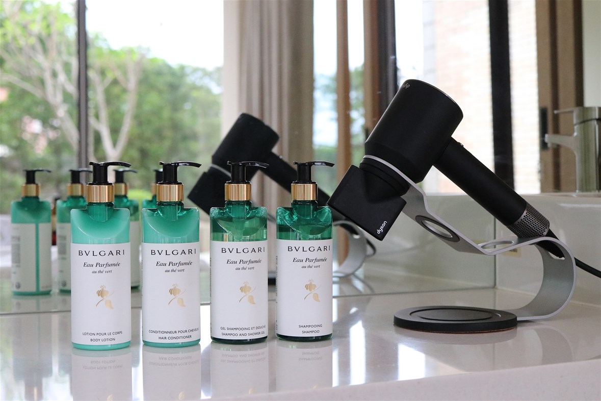 ▲客房內備有BVLGARI綠茶系列沐浴組 & Dyson吹風機(圖/大地酒店提供)