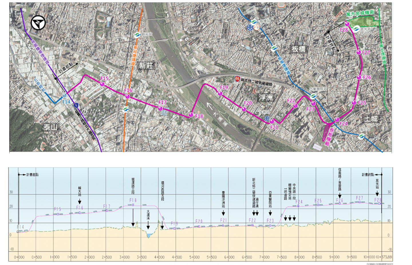 高架車站數增加7站!侯友宜表示,泰板輕軌規劃長度10.3公里、共14座車站,路線連接泰山、新莊、板橋、土城、中和地區,原先規劃F18及F24兩座高架車站、長2.5公里,至於F19~F23站(浮洲段)由於路線須從台鐵、高鐵與台65線高架橋下方穿越限制,須平面通行以確保安全性。而因應交通部審查意見,部分土地開發效益納入附屬事業收入以提高經營比,未符合計畫審議一致性及要求提升運量以確保財務永續經營,上述意見配合修正,並參考已通車捷運路線的經驗,決定將既有的2處高架段延長,增加7個高架車站,調整後高架段總長7.3公里、共有9座高架車站,分別為F15~F18站(新莊塭仔圳段)及F24~F28站(板橋中和土城農業區段),調整後列車同步能提高行駛速率,經估算全程行車時間可縮短11分鐘,以提升旅客搭乘意願及運量。