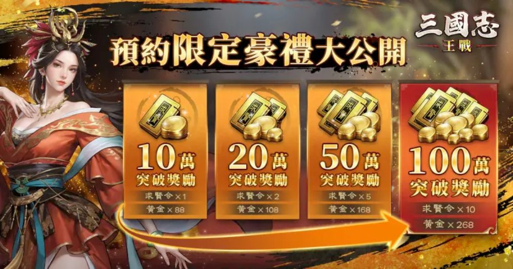 ▲參與《三國志:王戰》事前預約,隨著預約人數突破,將解鎖眾多豐厚獎勵。(圖/業者提供)