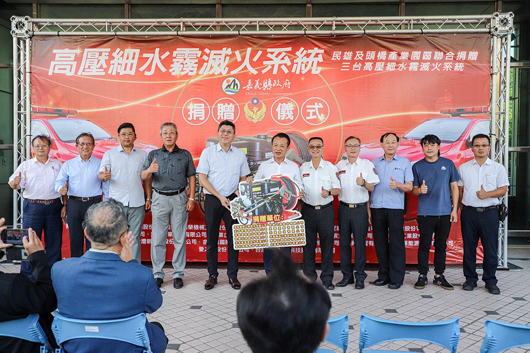 嘉義縣民雄及頭橋產業園區20家廠商,聯合捐贈嘉義縣消防局3台高壓細水霧滅火系統,為消防救災工作增添利器,設備總價達190萬,縣長翁章梁代表接受並頒贈感謝狀,感謝在地企業的慈善義舉。