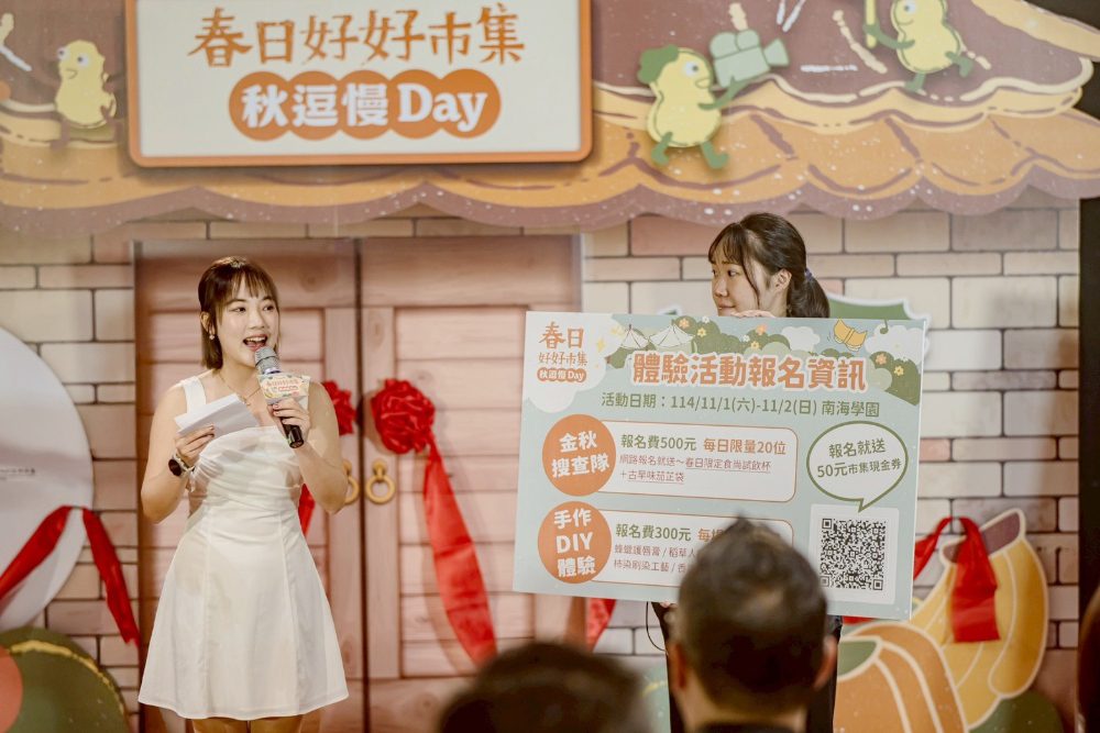 ▲主持人熱情介紹「春日好好市集」最受歡迎的親子體驗活動,包含「金秋搜查隊」與多項風格手作DIY,並宣布即日起開放線上報名。(圖/張辰卿攝)