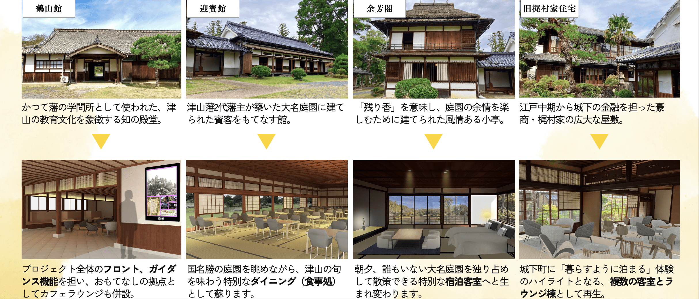 遊客將能入住津山市內各具特色的文化財建築中,像是位於國家史跡「津山城」內的「鶴山館」、國指定名勝「衆樂園」裡的「迎賓館」與「余芳閣」,以及被列為「國家重要傳統建築群保存地區」的「舊梶村家住宅」等四處文化財。透過步行探索小鎮、與當地居民互動,旅人能更深刻地感受津山的歷史底蘊,彷彿穿越回江戶時代。