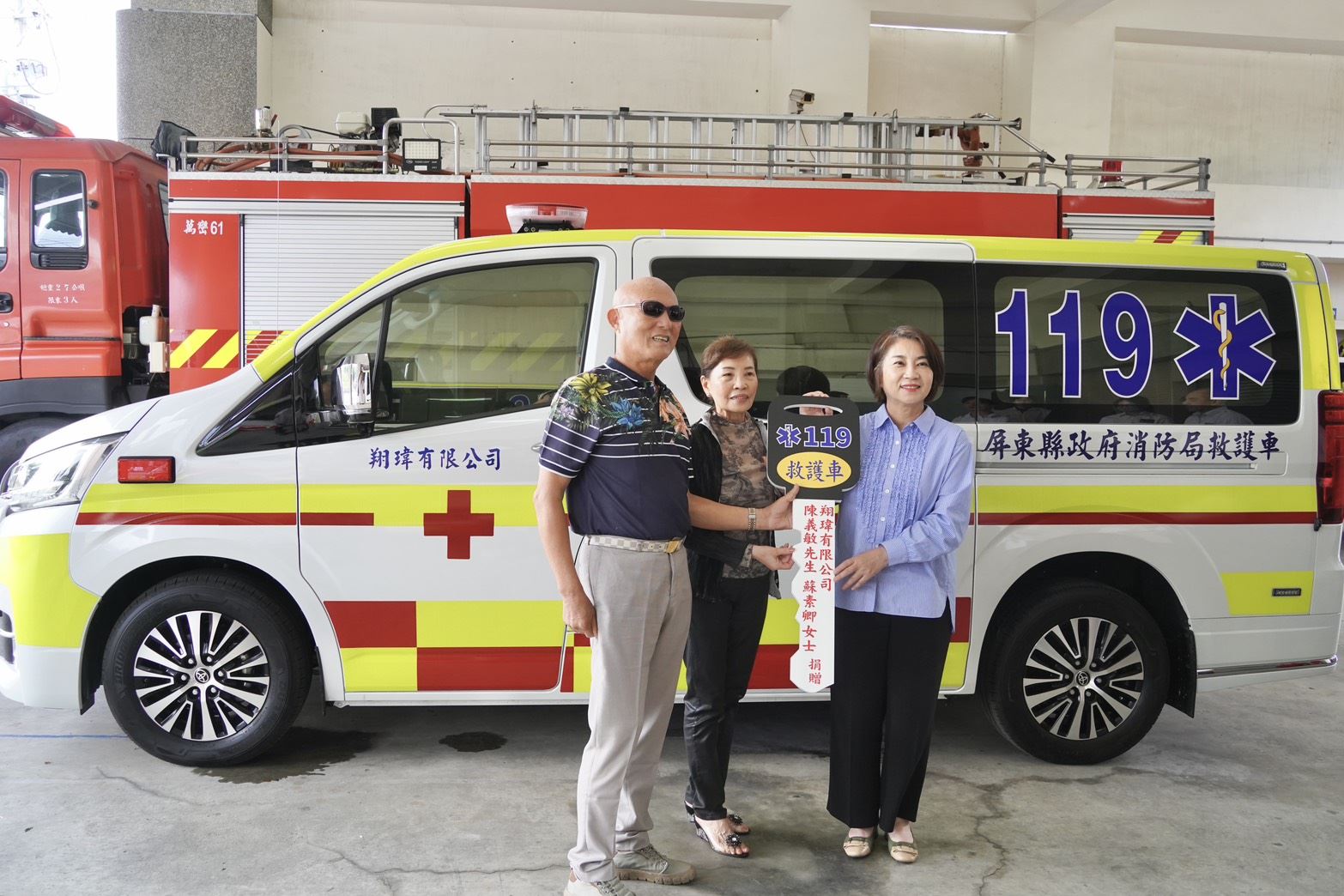【記者范家豪/屏東報導】  屏東縣到院前救護再添新戰力!為強化地方緊急醫療能量,翔瑋有限公司第二代接班人董事長陳佳榆與家族成員陳義敏、蘇素卿,今(15)日於萬巒消防分隊捐贈一輛救護車予屏東縣政府,由縣長周春米代表受贈及致贈感謝狀,隨後,周縣長與第一線消防同仁召開座談會,傾聽基層需求,期盼共同提升縣內緊急救護服務品質。