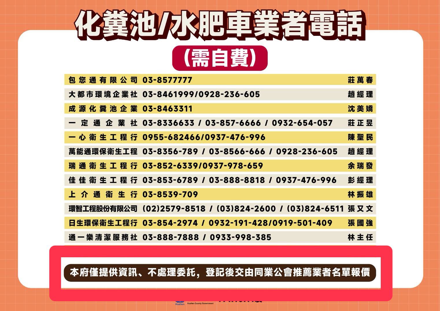 ▲花蓮縣堰塞湖溢流災民需要整理化糞池等,縣府提供連絡資訊,並非外傳的圖利業者。(圖/縣政府提供)