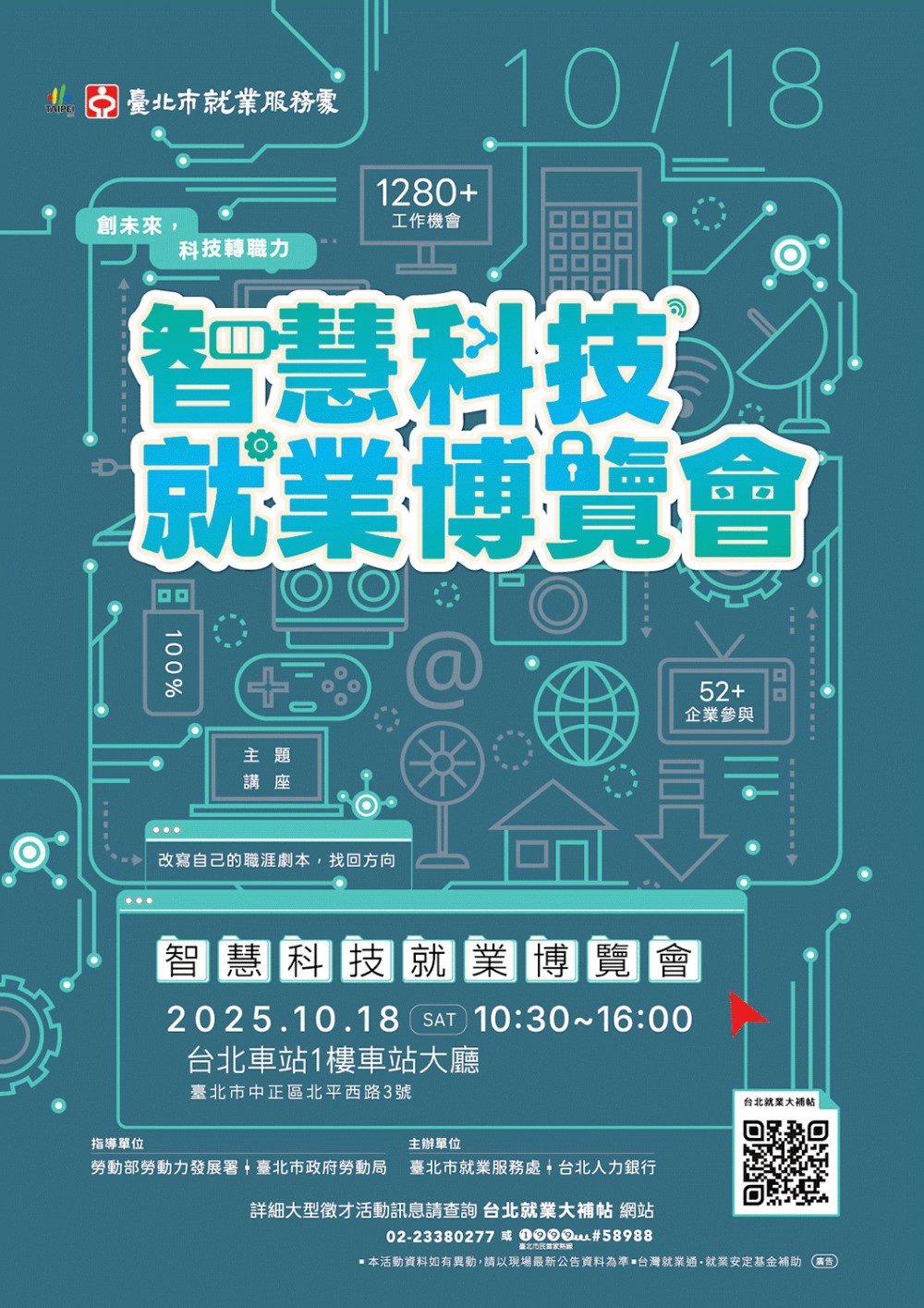 臺北市政府勞動局將於114年10月18日(六)上午10時30分至下午4時,在台北車站1樓大廳舉辦「智慧科技就業博覽會」。此次活動以蔣萬安市長針對關稅衝擊,基北北桃發表聯合聲明為前提,由四市勞政機關首長首度透過視訊連線,共同推動「四城同行.韌性升級」系列行動。在四市將共享產業與勞動監測資訊,建立跨區就業服務平臺之基礎下,同步推出身心障礙者職業重建服務活動暨成果發表會、智慧科技就業博覽會、就業博覽會、職訓成果展暨技藝達人表揚等特色活動,展現地方政府齊心守護產業、護航勞工的決心。