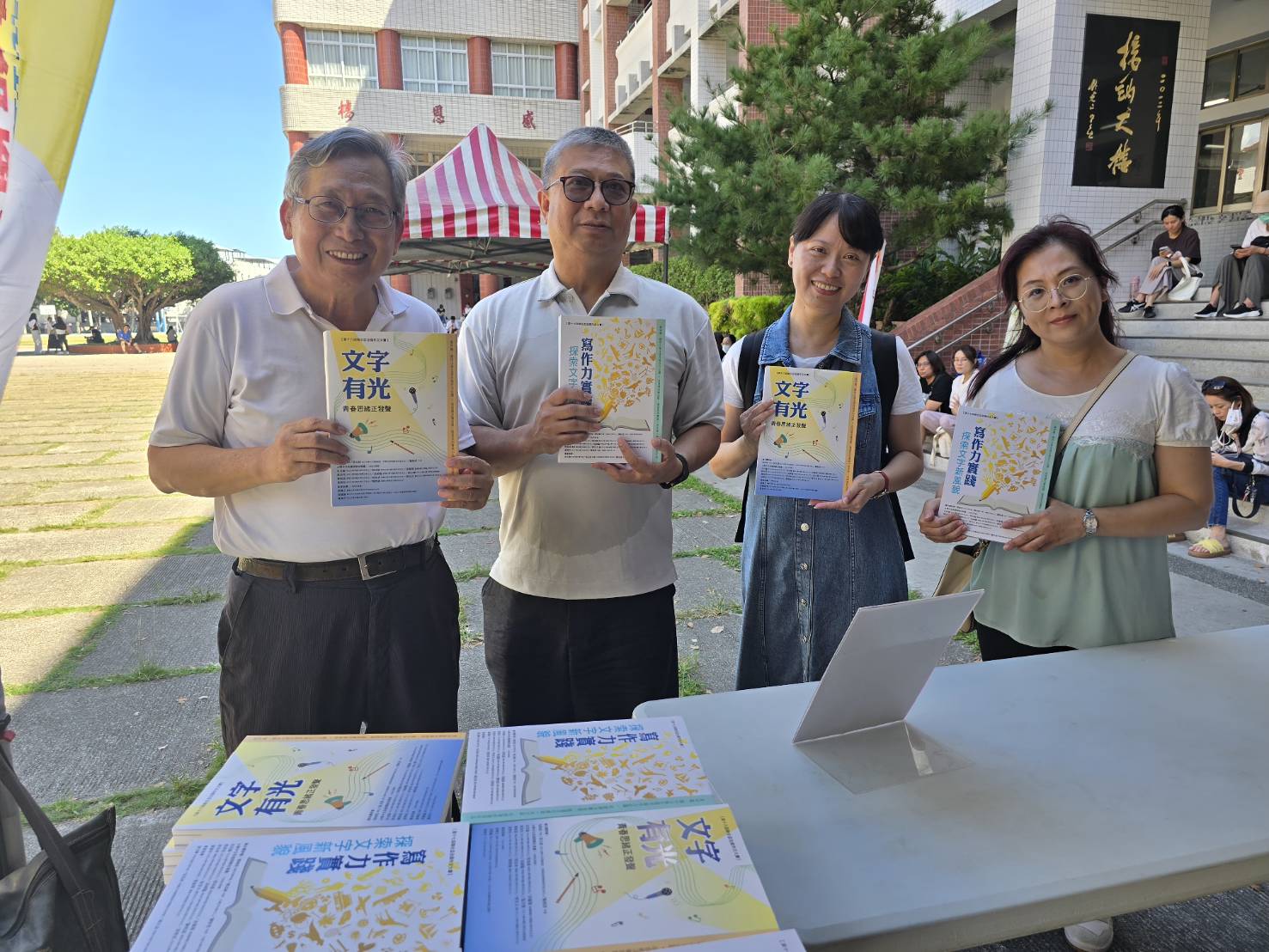 ▲聯合報花蓮分社主任王子玲(左起)、萬榮國中校長許瓊櫻、四維高中校長蔡忠和、聯合報印發中心經理李宗翰、花蓮縣政府終身教育科承辦馬靜敏等人,都對各種作文指引大為激賞。(圖/范振和攝,下同)