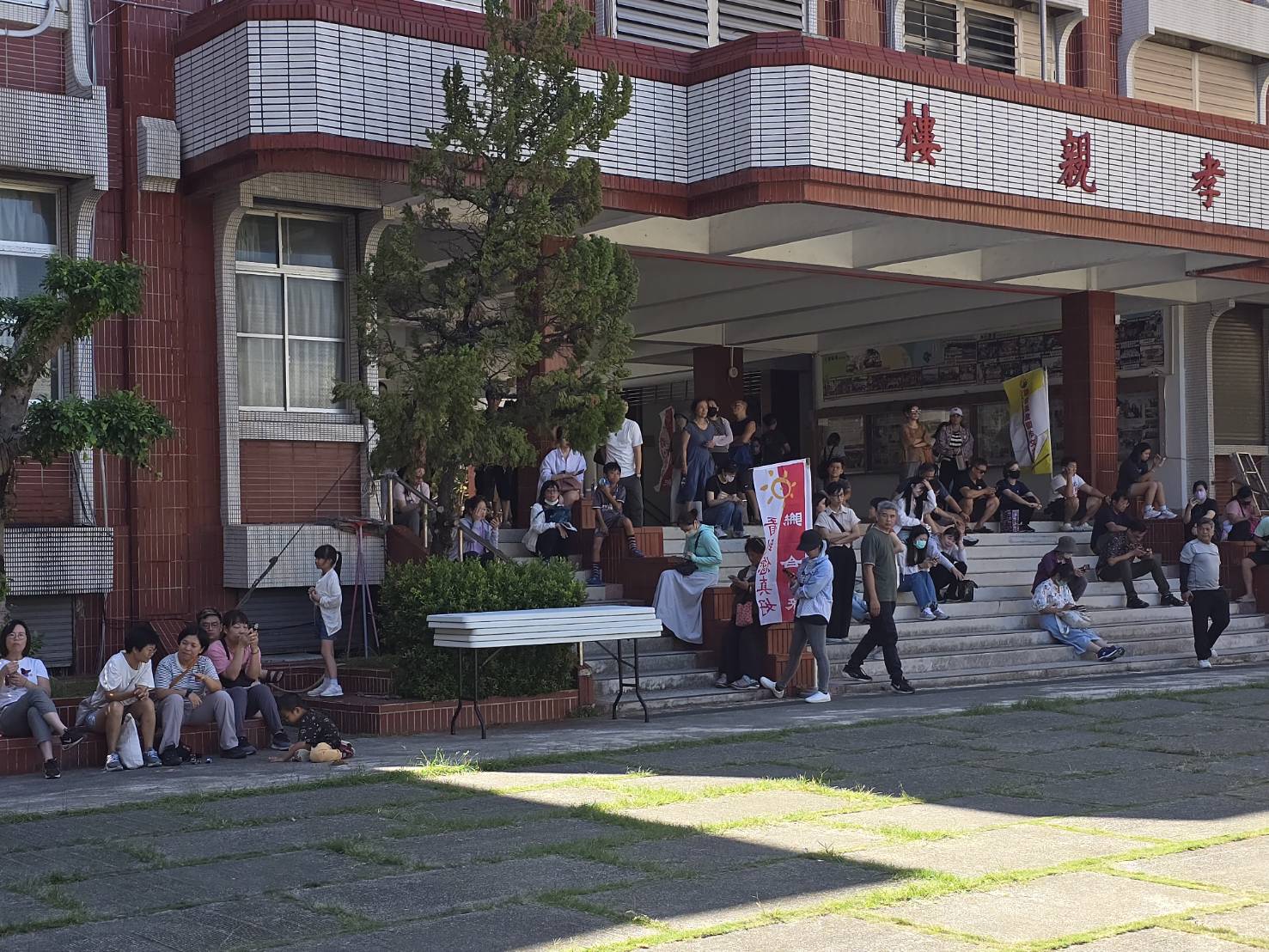 ▲不少陪考家長在四維高中校門穿堂或坐或站,疼惜親情溢於言表。