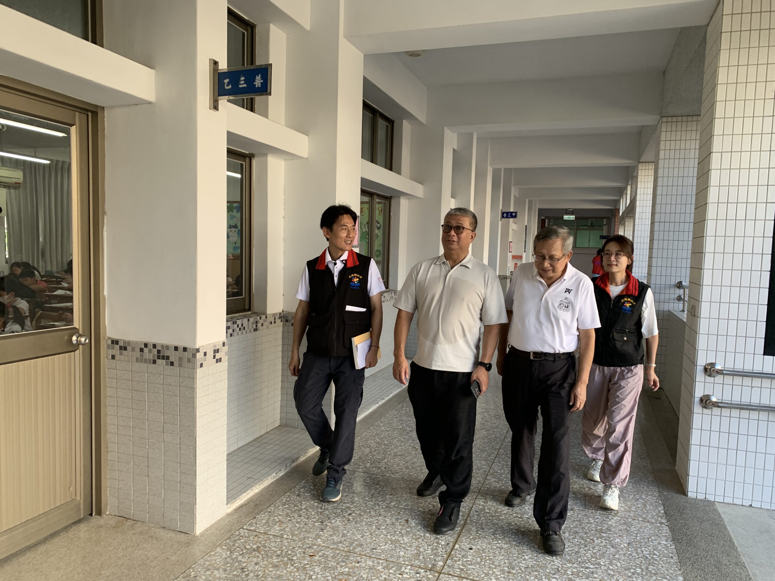 ▲聯合報印發中心經理李宗翰(中)偕同縣府教育處終身教育科長王永杰(左)、四維高中校長蔡忠和(右)巡視考場。